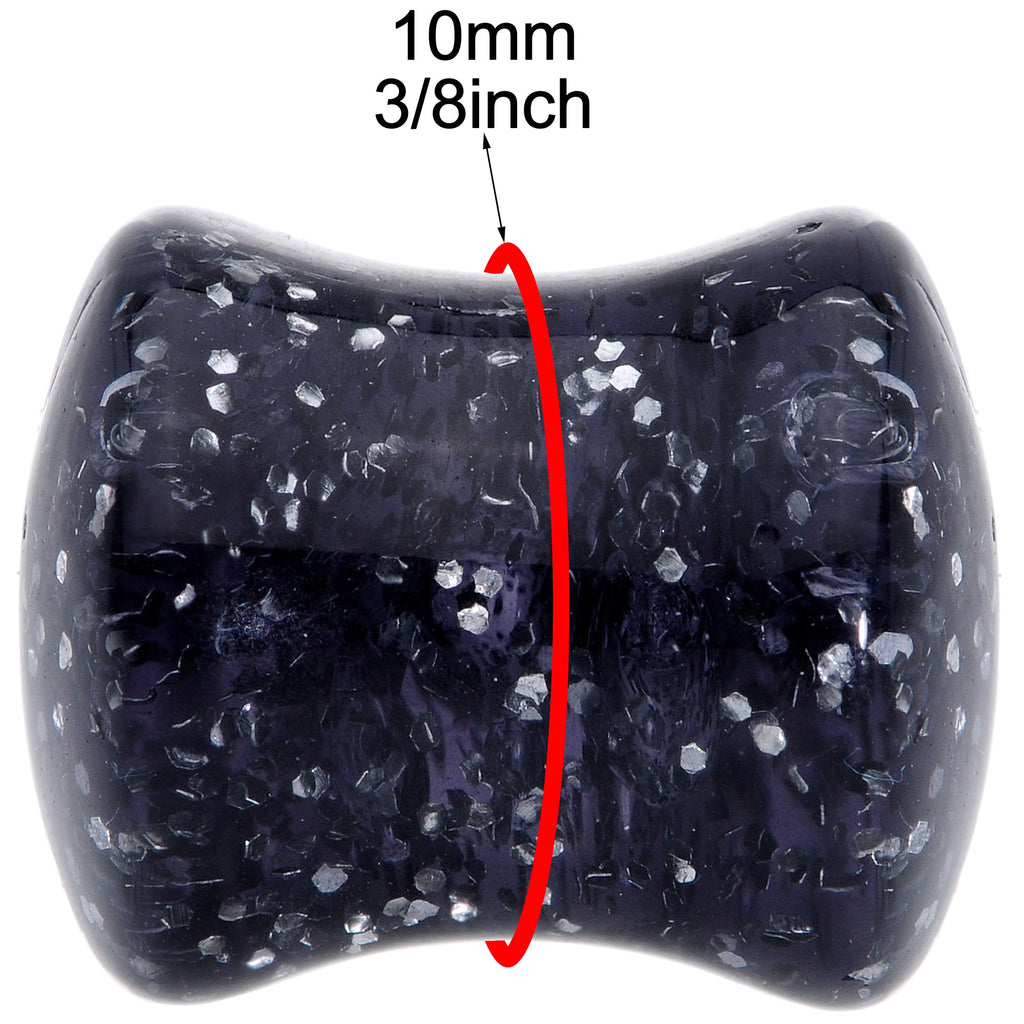 Add some glitter to your look with this pretty pair of black acrylic ear plugs. Made with solid black acrylic with an ultra glitter pattern, this pair of 10mm ear gauges are made with a saddle style design for comfortable wear and are sold as a set of two for you.
