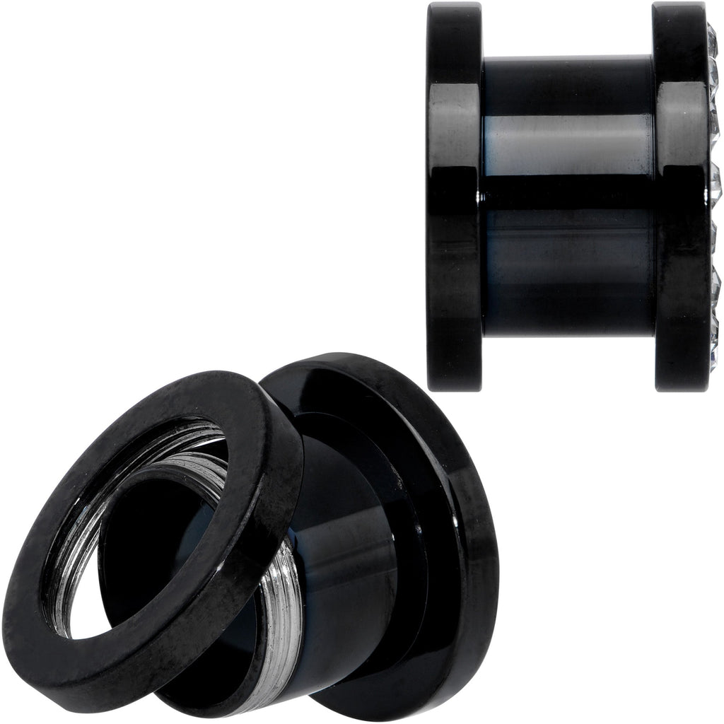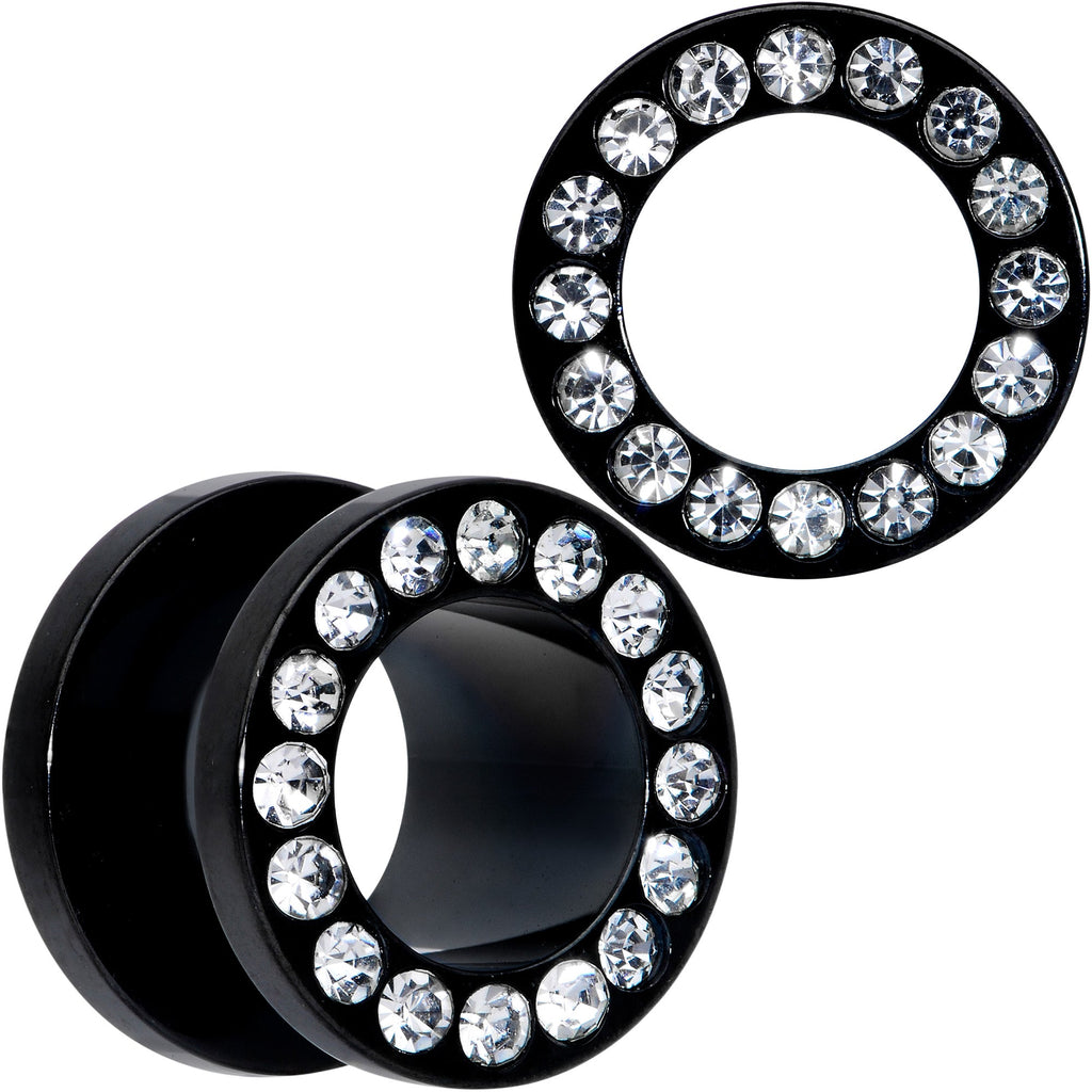 Fill your stretched lobes with tunnels of love with these 10mm tunnel plugs! They're made with black anodized over 316L surgical grade stainless steel and feature a row of clear gems all around the outer flare. They also feature screw-fit backs for easy insertion and removal. For look you'll dig, these tunnels are sure to glam up your lobe piercings! Sold as a set of two.Specifications