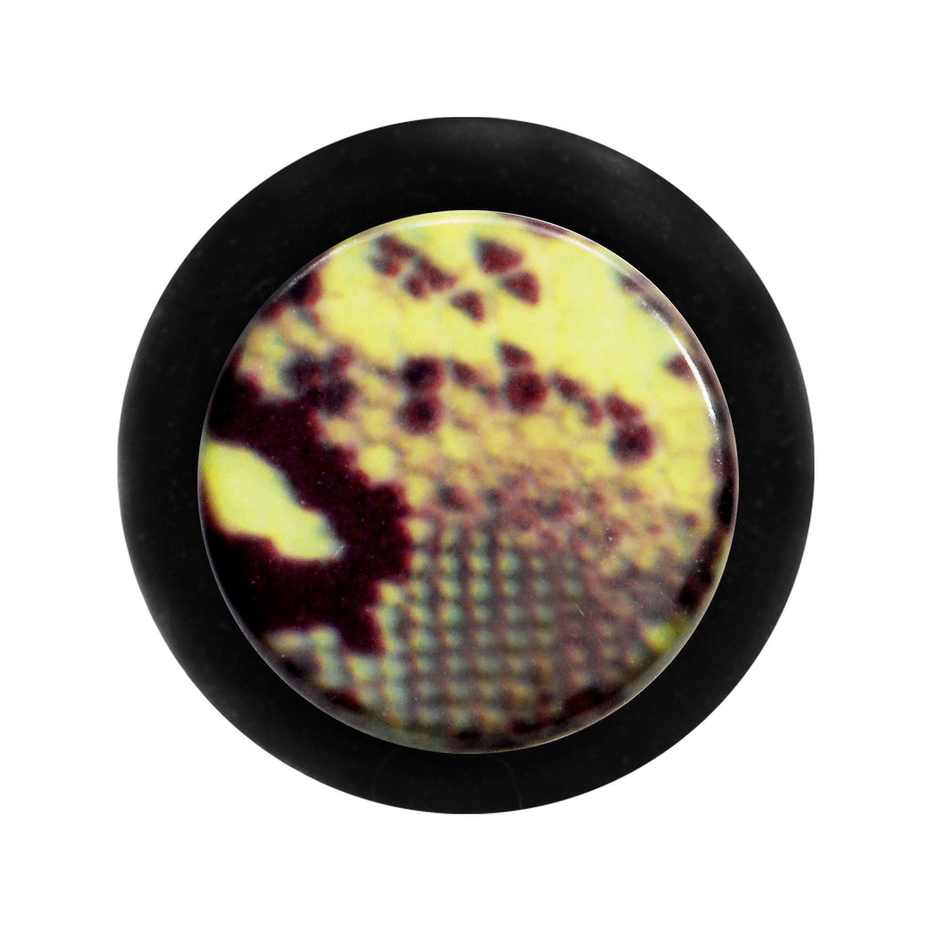 Taper plug sold individually, purchase a quantity of 2 for a pair. Acrylic body jewelry ear taper with a snake skin design. 10mm taper expander with slithering style.