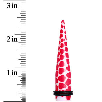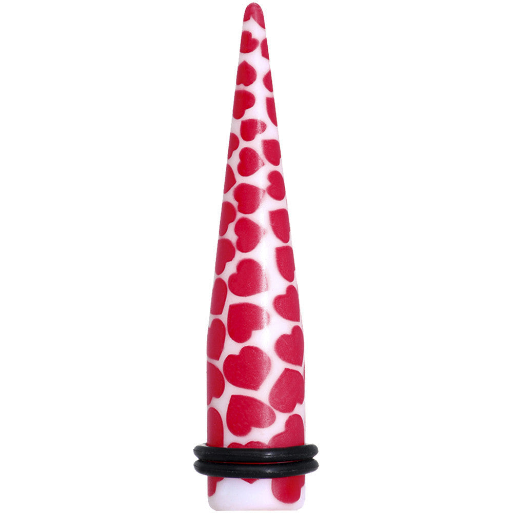 Hypoallergenic jewelry for sensitive skin.10mm ear taper. This white acrylic ear plug features vibrant red hearts. Heart ear expender featuring two rubber O-rings. Body piercing ear taper sold individually.