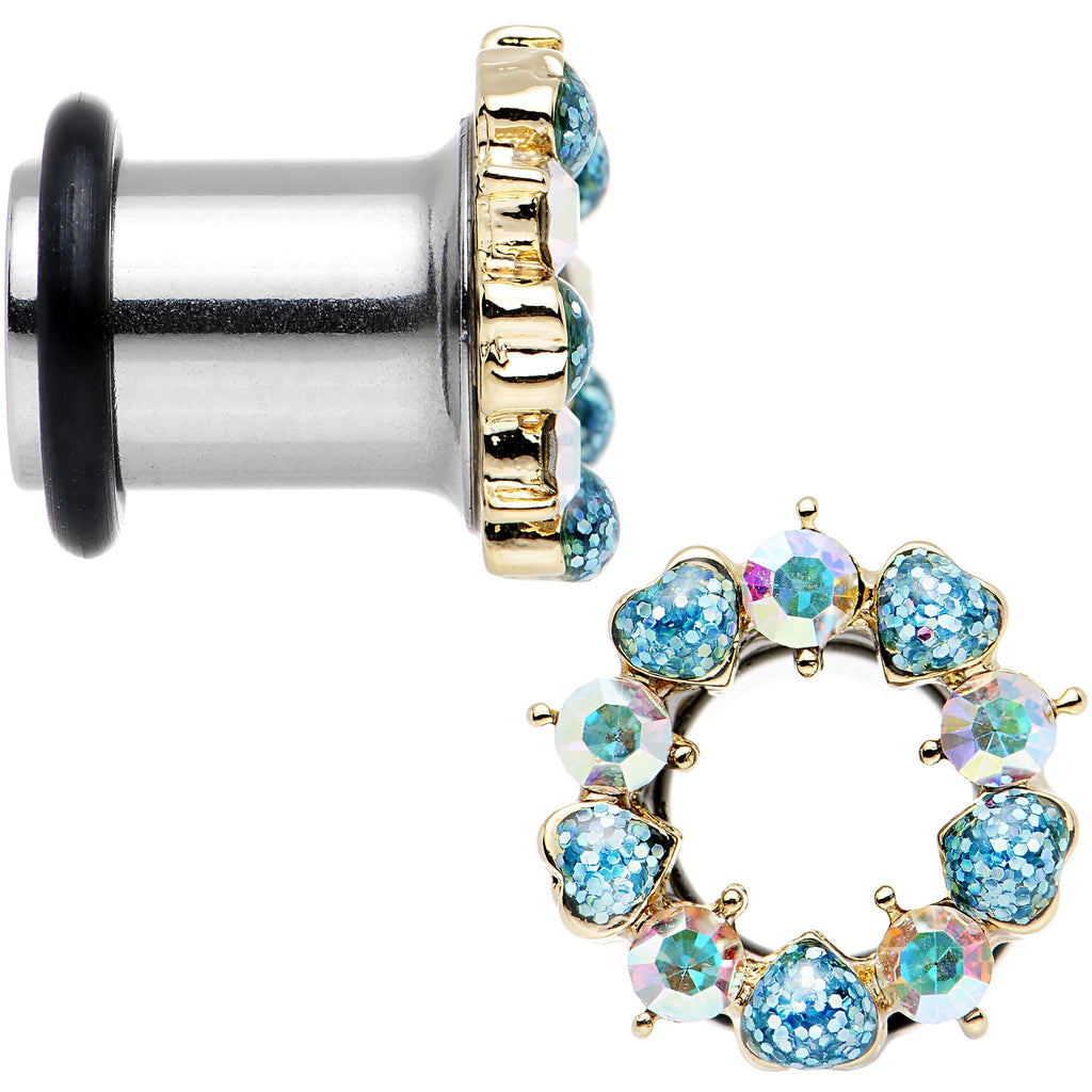 Show off your unique style when you wear this lovely set of 8mm tunnel plugs. A wreath made of aurora and aqua gem hearts is featured on this pair of single flare plugs made with 316L surgical grade stainless steel that will add glamorous style to your stretched ear lobes.