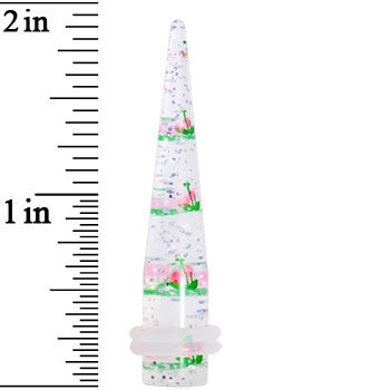 Hypoallergenic jewelry for sensitive skin.Sold Individually, Please purchase a quantity of 2 for a pair. 0 Gauge glitter straight taper. Clear acrylic taper ear plug with pink cherry pattern. Cherry taper Body Jewelry.