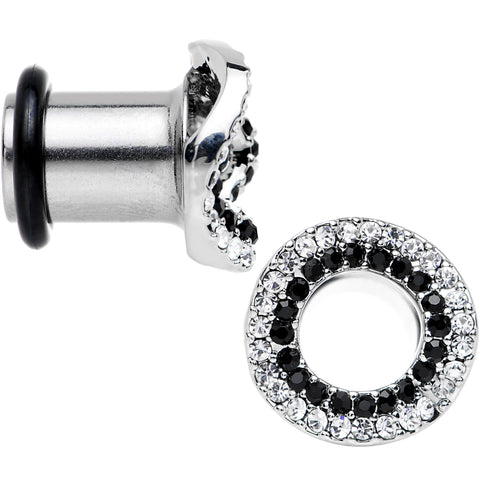 Go ahead and act a little warped when you wear these unique 8 millimeter ear gauges. This set of single flare tunnels are made with surgical grade stainless steel and feature a wavy, curving ring of clear and black gems that will add asymmetric style to your body jewelry collection.