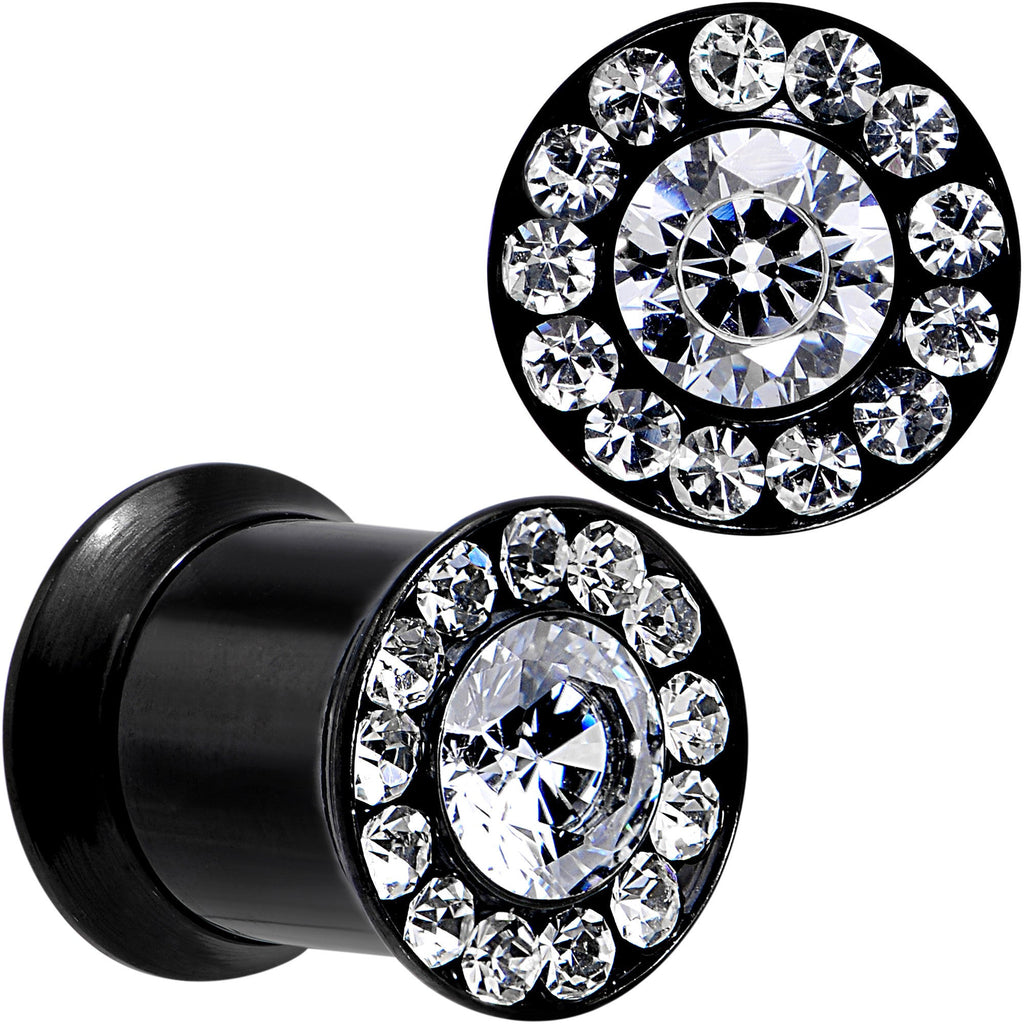 Dress up your lobes with glamorous, eye-catching style when you wear this pretty pair of double flare plugs. Made with black PVD over 316L surgical grade stainless steel, this set of 8mm ear gauges feature one large clear front cubic zirconia gem surrounded by a series of smaller clear gems, a screw fit design for easier insertion and removal, and is sold as a set of two for the absolutely glam goddess (or god!) in you!
