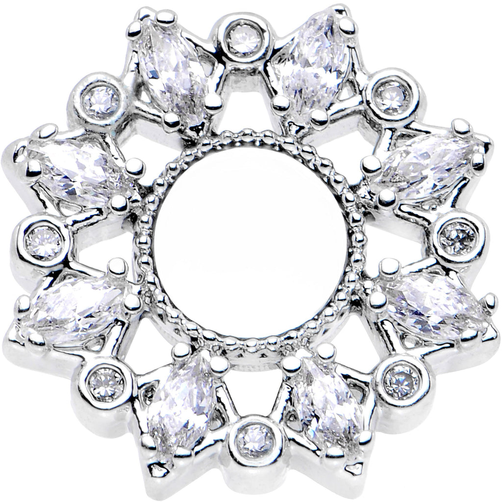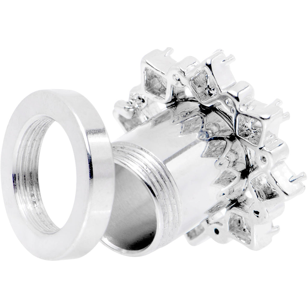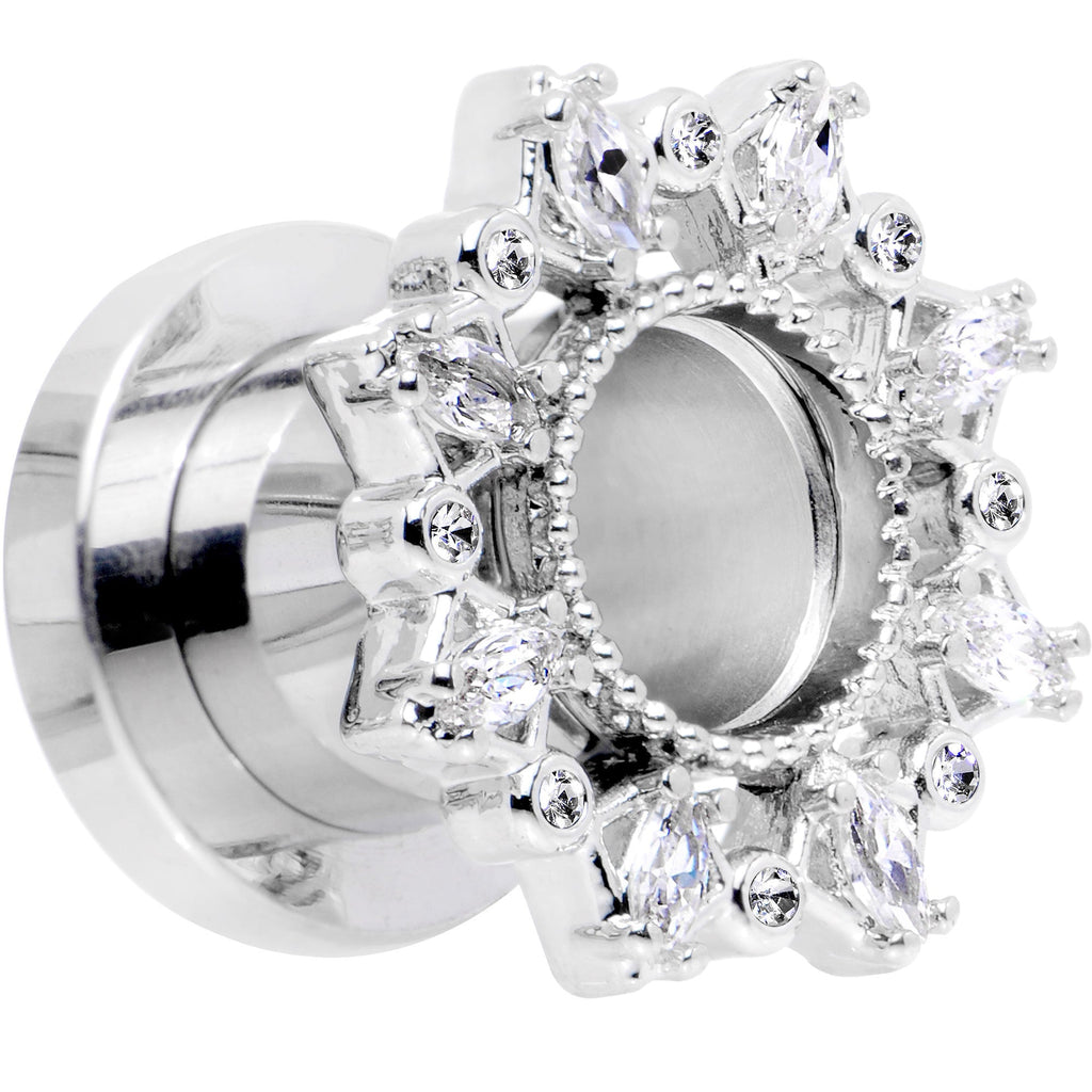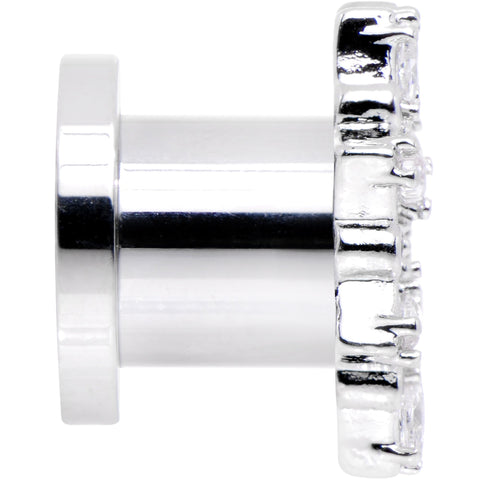 Add a little decadent flair to your stretched lobes whenever you wear this pair of pretty double flare plugs. Made with durable 316L surgical grade stainless steel, these 8mm ear gauges feature a front flare set with clear gems to catch the eye of your beholder. This pair of plugs is made with a screw fit design for easier insertion and removal and is sold as a set of two.