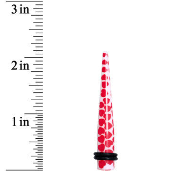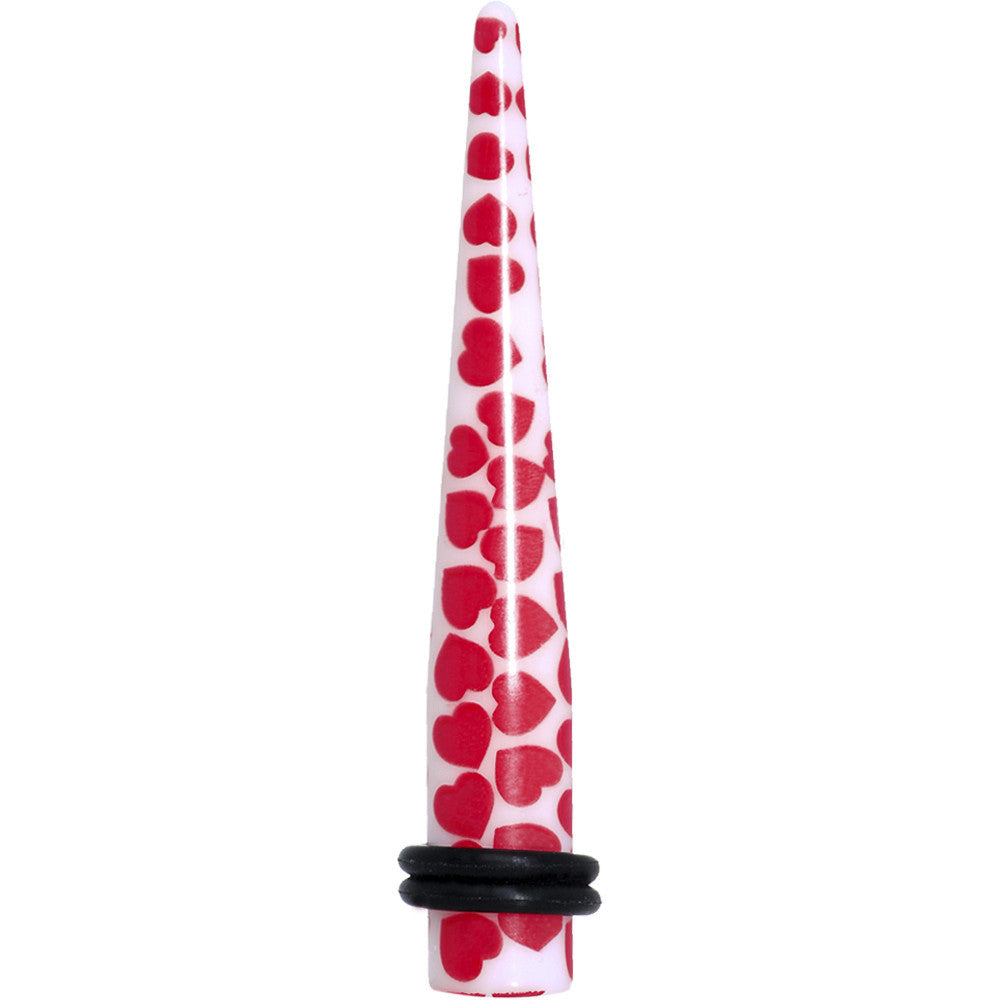 Hypoallergenic jewelry for sensitive skin.8mm ear taper. This white acrylic ear plug features vibrant red hearts. Heart ear expender featuring two rubber O-rings. Body piercing ear taper sold individually.