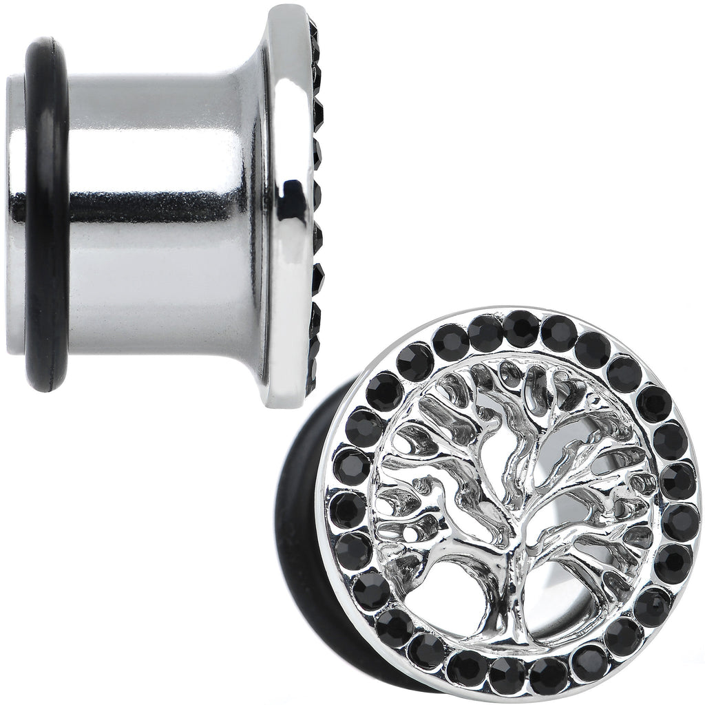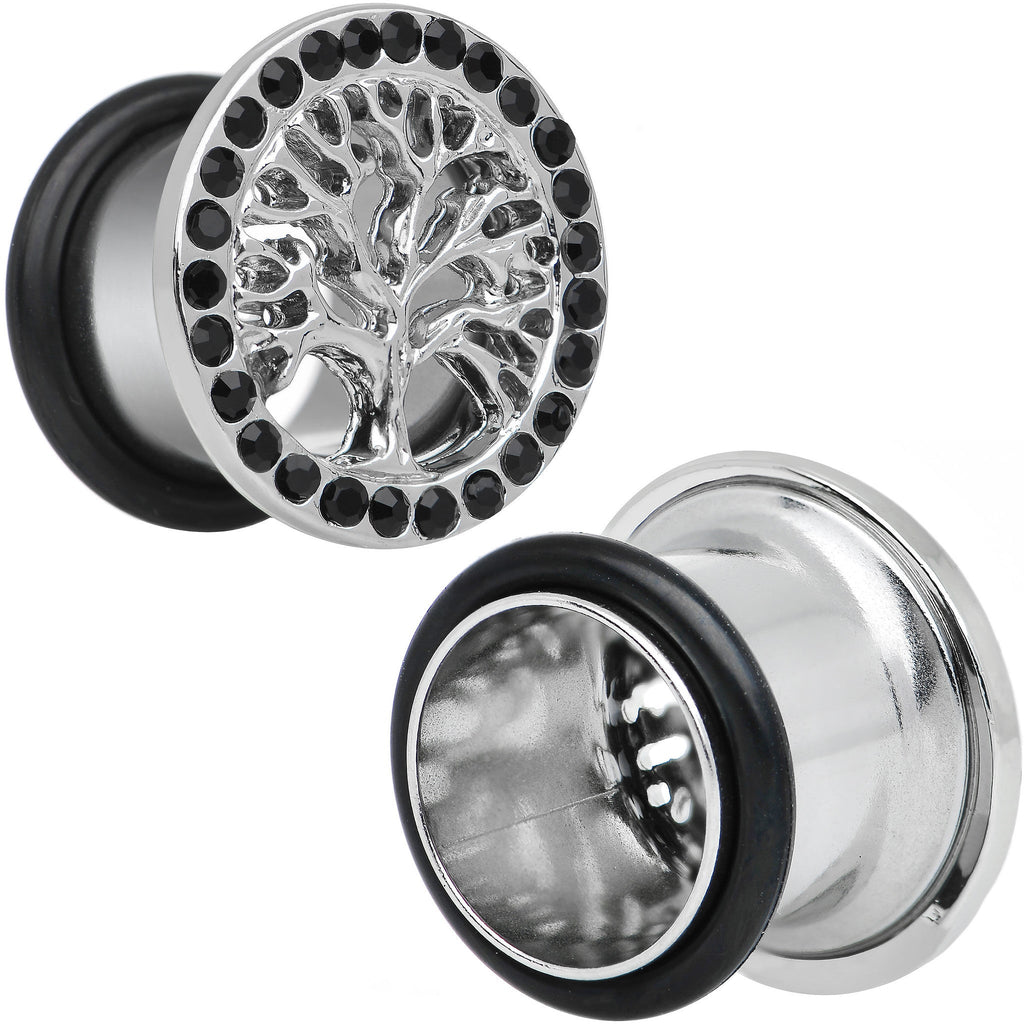 These 1/2" single flare tree of life plugs surrounded by black gems are a must-have for any plug jewelry wearer who is looking for something that is both spiritual and stylish. Made of 316L surgical grade stainless steel and worn with rubber o-rings, these ear gauges are sold in sets of two.