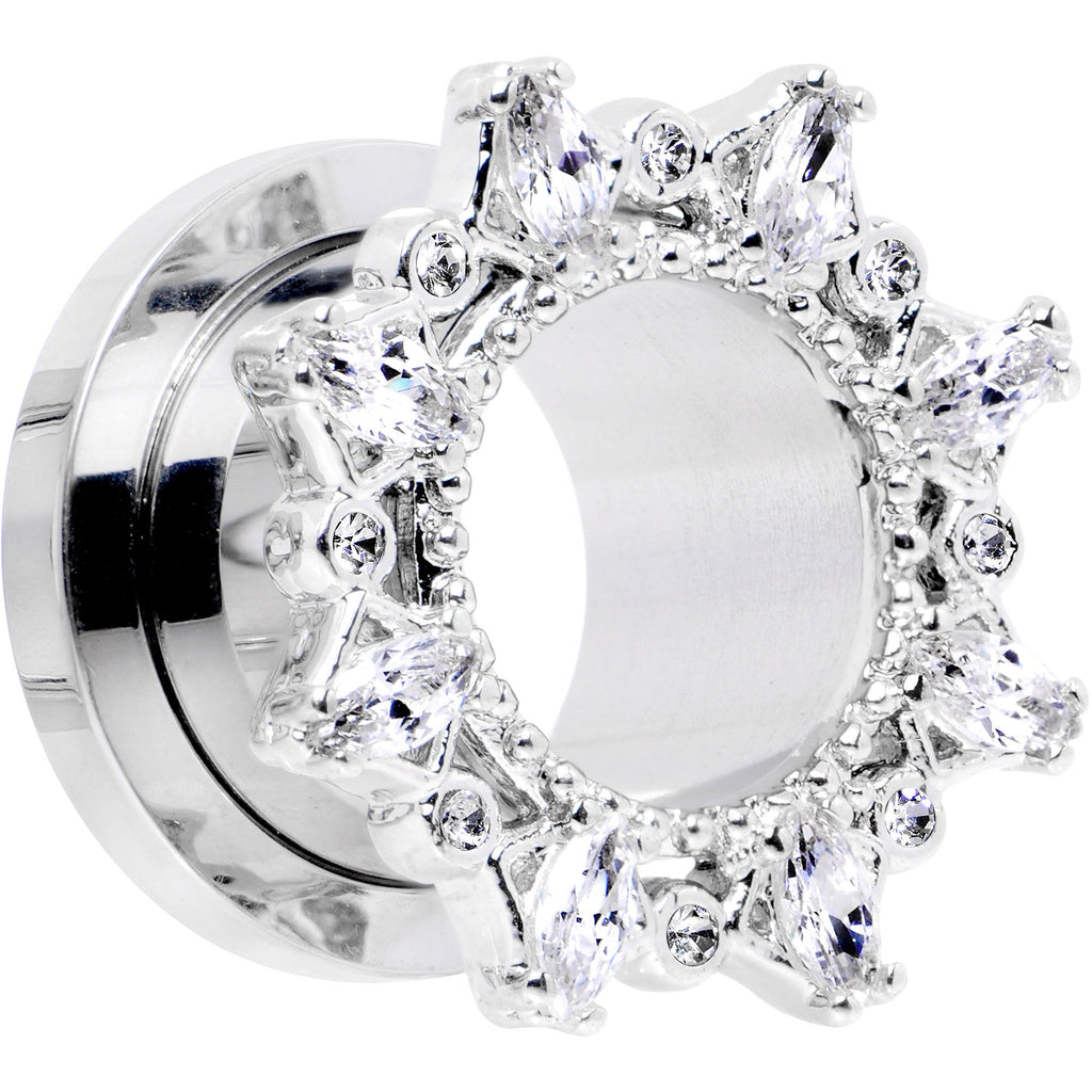 Add a little decadent flair to your stretched lobes whenever you wear this pair of pretty double flare plugs. Made with durable 316L surgical grade stainless steel, these 12mm ear gauges feature a front flare set with clear gems to catch the eye of your beholder. This pair of plugs is made with a screw fit design for easier insertion and removal and is sold as a set of two.