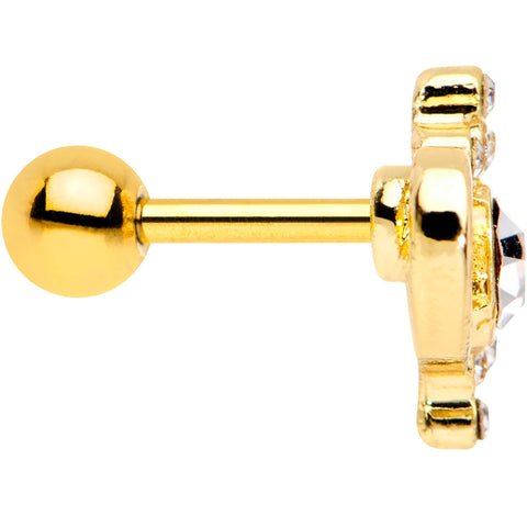Wear your heart on your sleeve, or in this case on your ear, with this beautiful heart-shaped cartilage stud. This heart-shape stud features a cluster of clear gems surrounding one large central clear gem. The 16 gauge heart charm is mounted on a 1/4" straight barbell made with gold PVD over 316L surgical grade stainless steel. Great for a tragus piercing or other cartilage piercings.