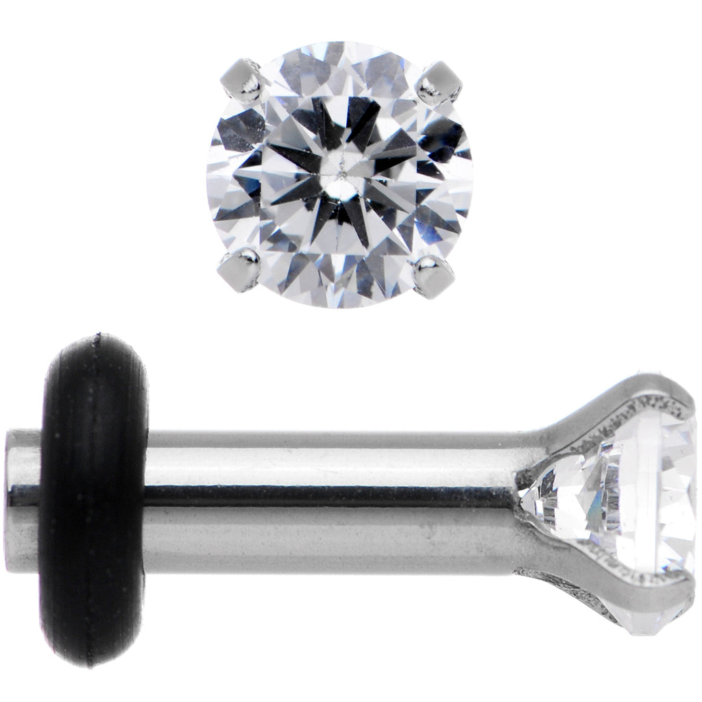 10 gauge plug. Sparkling cubic zirconia plug. This surgical steel plug features a prong set cubic zirconia and a rubber o-ring. Item is sold individually.