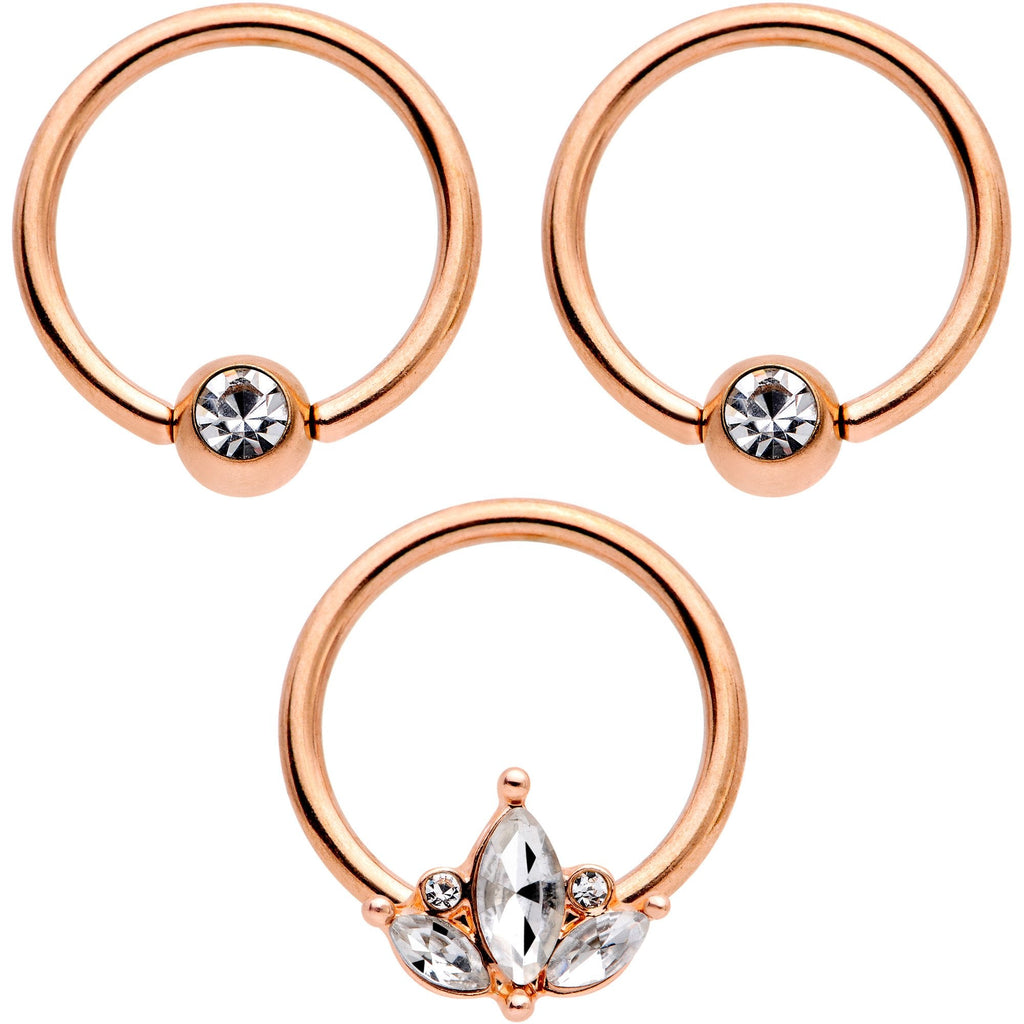 This set of 14 gauge captive piercings is practically a whole body jewelry wardrobe! Each one is made with a 13mm rose gold tone PVD over 316L surgical grade stainless steel captive ring. You get two that have clear gem captive beads as well as one that features a captive charm with three clear oval cubic zirconia gems in a fan shape with two small round cubic zirconias at the center. The look is immediately eye-catching and impossible to ignore, with opulent rococo styling. Sumptuous or stylish, this set of captive rings can be worn in a variety of piercings including your nipples and septum as well as cartilage piercings like your helix or stretched lobe piercings! Sold as a set of three.