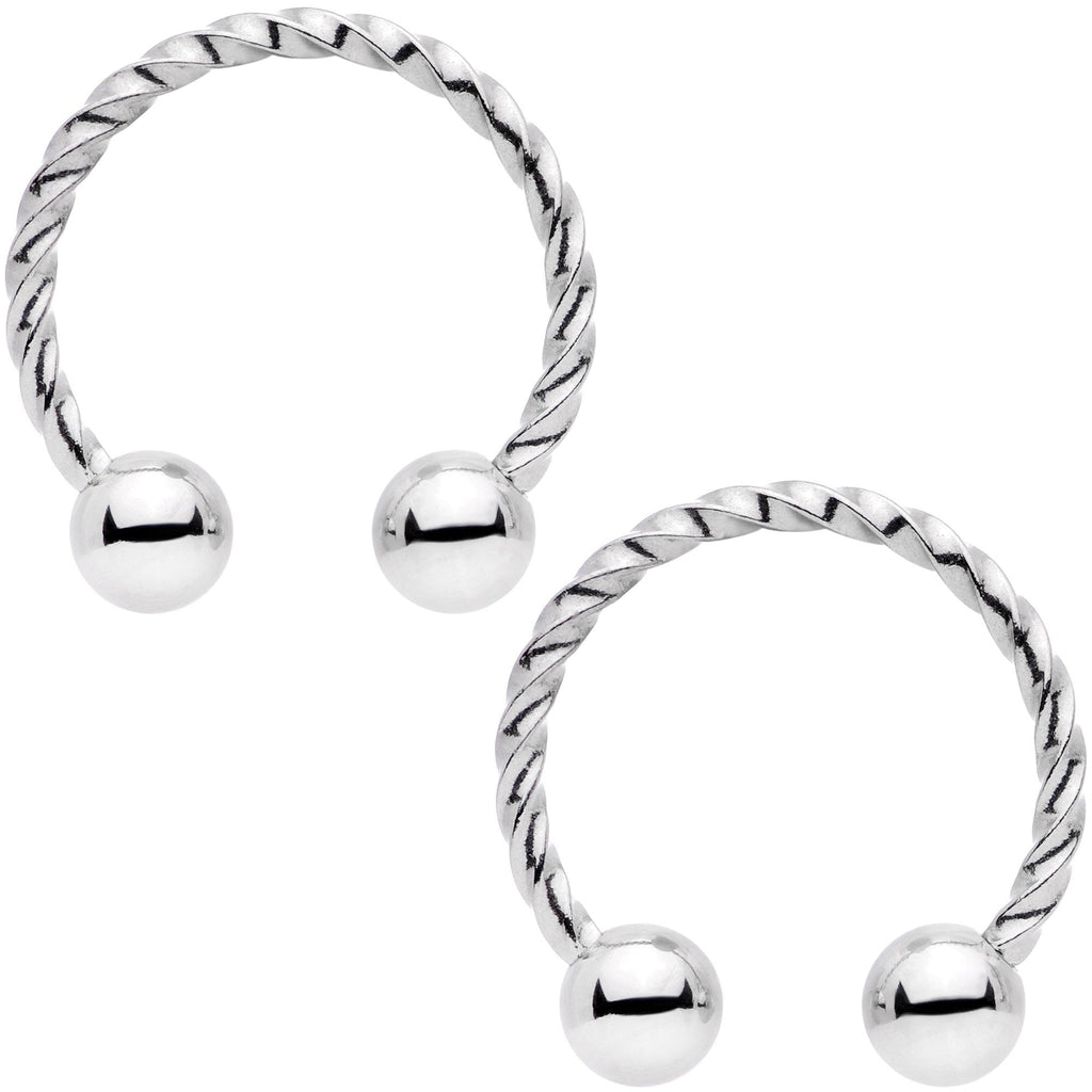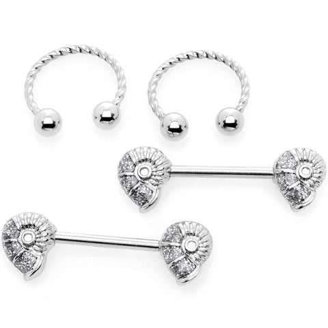 Double the jewelry, double the fun! This set comes with two different types of 14 gauge jewelry. First, tipped with carefully detailed seashells, are durable 316L surgical grade stainless steel straight barbells, each one at 14 mm in length. The set also includes two of our elegantly twisted 12mm durable 316L surgical grade stainless steel horseshoe barbells. Whether you want these to share or keep them all to yourself, this set gives you plenty of options for how to adorn your nipple piercings. Sold as a set of four.