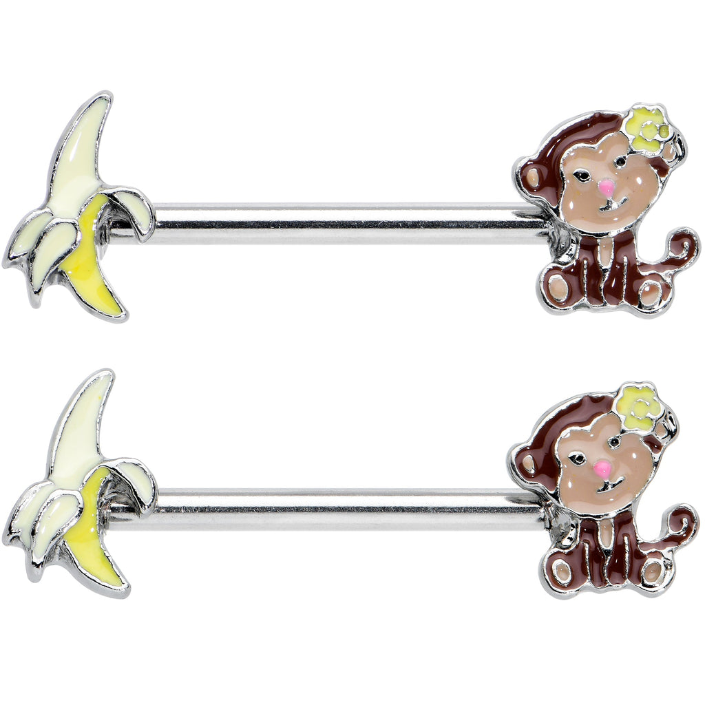 No need to monkey around with boring nipple jewelry when you're rocking these 14 gauge nipple rings! They're made with 12mm durable 316L surgical grade stainless steel straight barbells. One end features a monkey charm, inlaid in shades of brown and featuring a yellow inlaid flower in its hair. The other end features a half-peeled banana, inlaid in yellow and just waiting to have a bite taken out of it! You're going to go bananas over this adorable monkey-themed nipple piercing jewelry! Sold as a set of two.