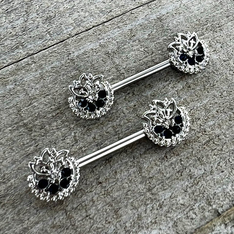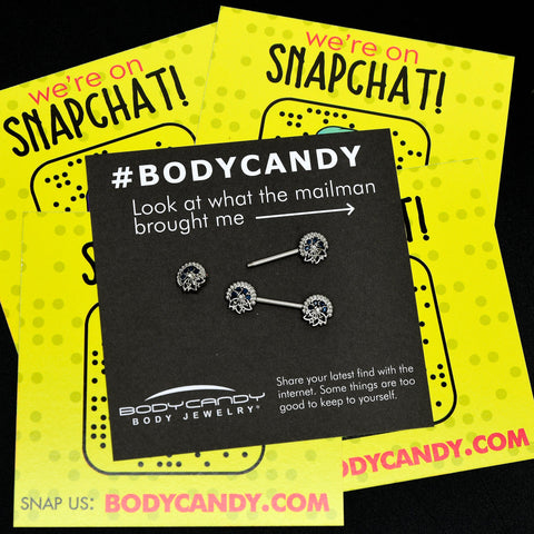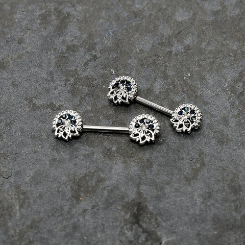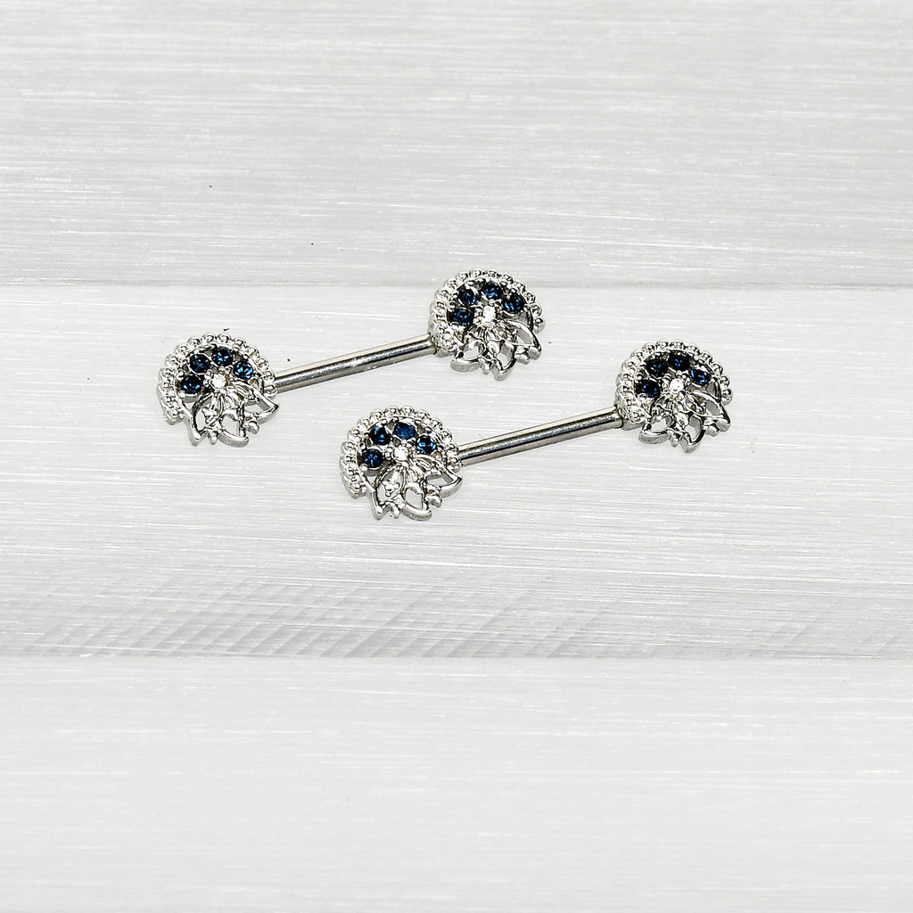 The curves on this 14 gauge nipple jewelry are sure to catch eyes! It's made with 12mm durable 316L surgical grade stainless steel straight barbells. Each of the ends features an abstract arch charm, with the outermost rims set with textured embellishment and the inner curves set with deep blue gems. Below those are abstract flower designs with clear gem centers. Get abstract with these elegant nipple piercing rings! Sold as a set of two.Specifications