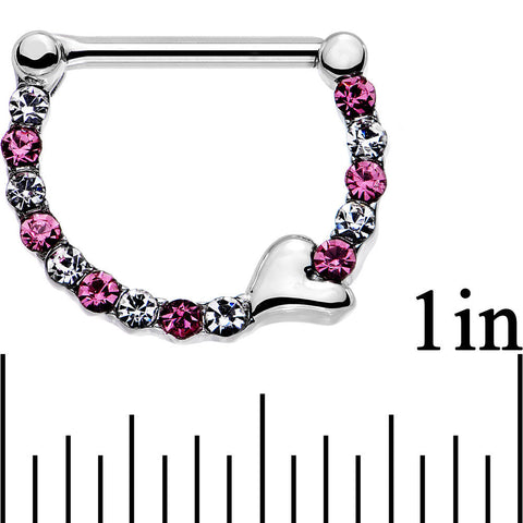 Feeling bored with your usual nipple jewelry? Well, this nipple clicker set might be the answer to your style woes. This 14 gauge nipple ring set features 12mm long straight hinged barbells made from durable 316L surgical grade stainless steel for easy insertion and removal from your nipple piercing. The perks don't end there: this nipple clicker set features a line of alternating pink and clear gems with the added highlight of a heart charm along the bottom curve of this body jewelry that will be begging to be shown off.