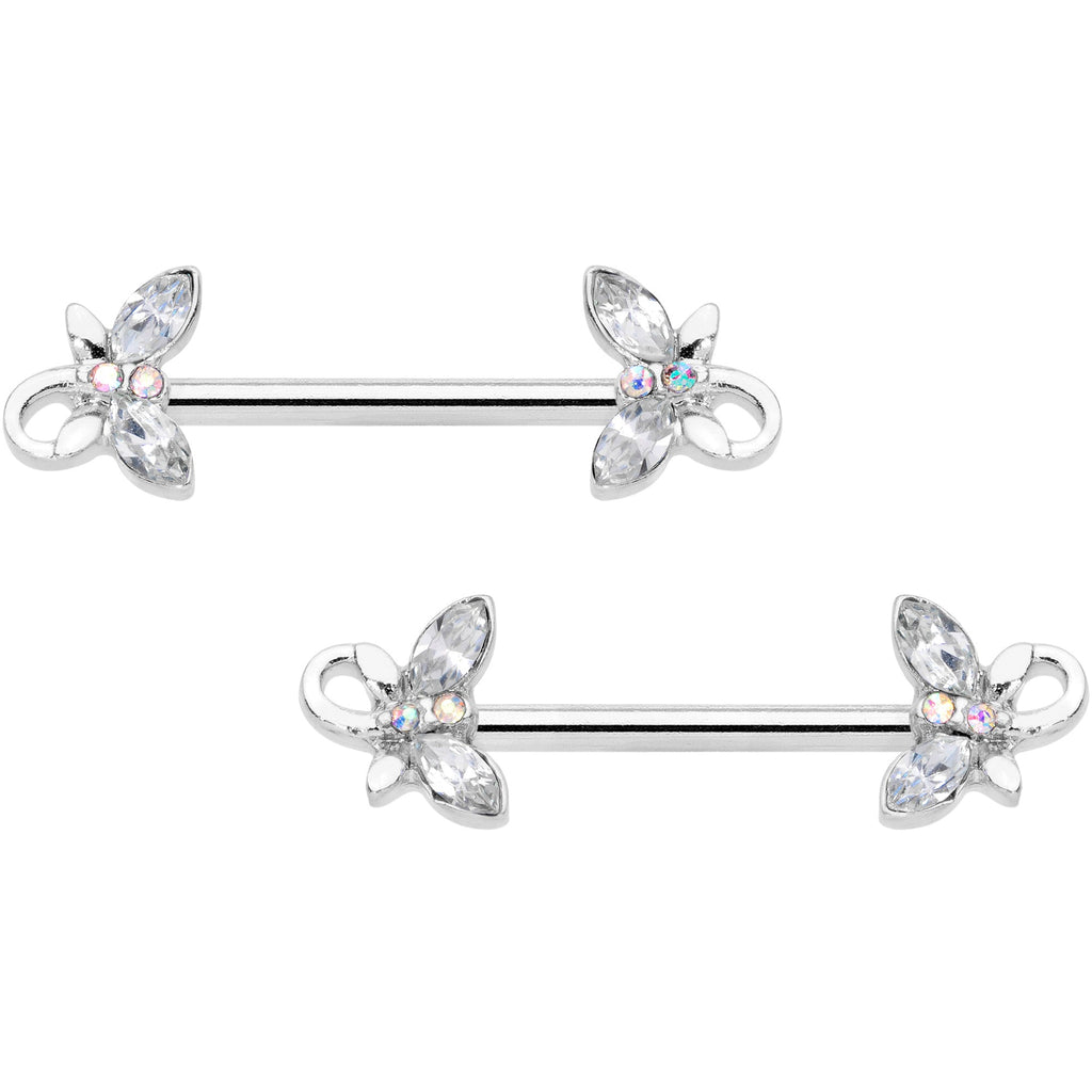 The lovely butterflies on this 14 gauge nipple jewelry are so elegantly structured they might leave you feeling a touch loopy! They're made with 12mm durable 316L surgical grade stainless steel straight barbells. Each end features a butterfly charm composed of clear and aurora color gems. The butterflies each feature an openwork loop in their wings, giving them an airy feel with eye-catching detail. Why get butterflies in your stomach looking for the loveliest nipple piercing jewelry when you could have these butterflies in your nipple piercings? Sold as a set of two.Specifications