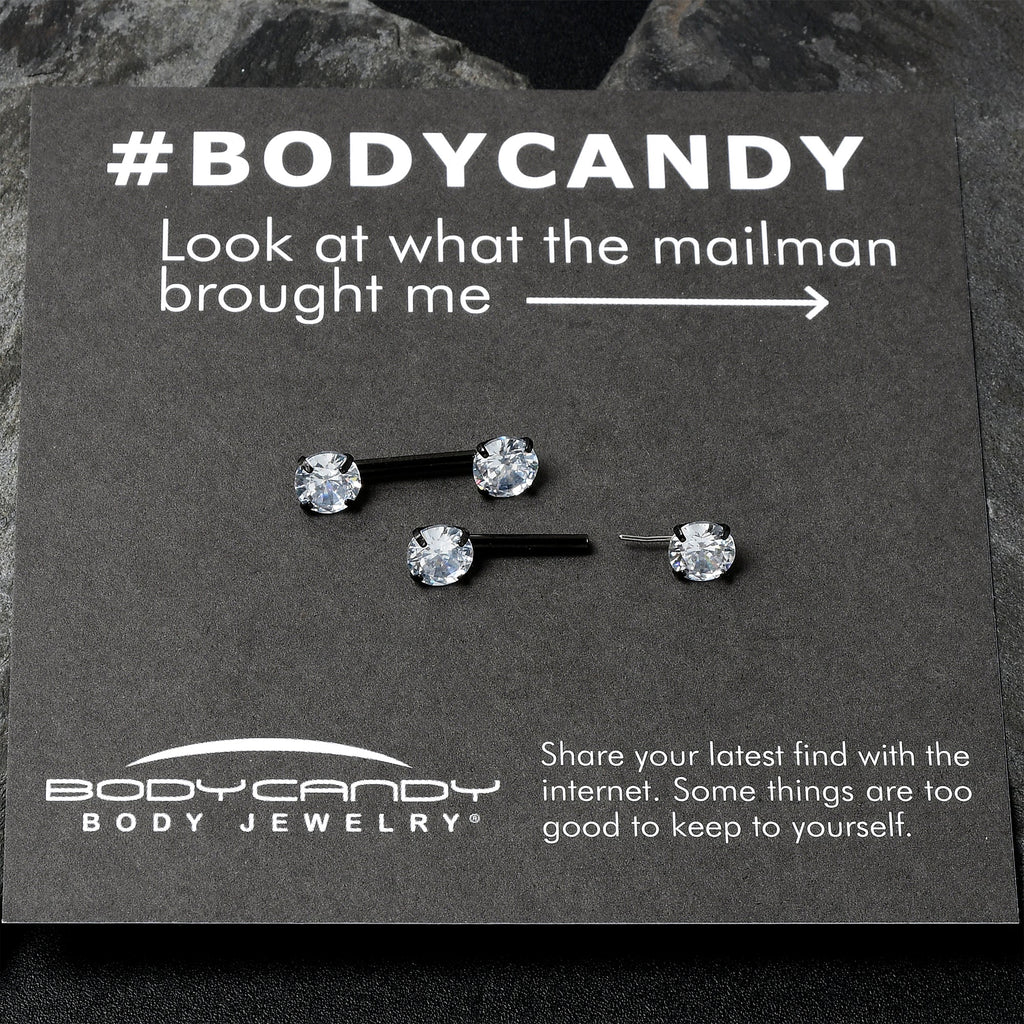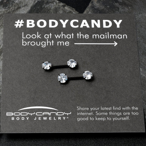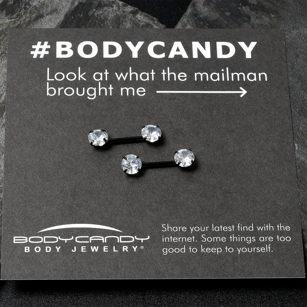 Add some sexy sophistication to your nipple piercings with this 14 gauge nipple jewelry! It's made with 12mm black PVD over 316L surgical grade stainless steel straight barbells. The charm ends are threadless round clear cubic zirconia gems made to make insertion and removal a breeze while still offering a secure fit. With their easy elegance and uncomplicated sophistication, these nipple piercing rings really do have it all! Sold as a set of two.