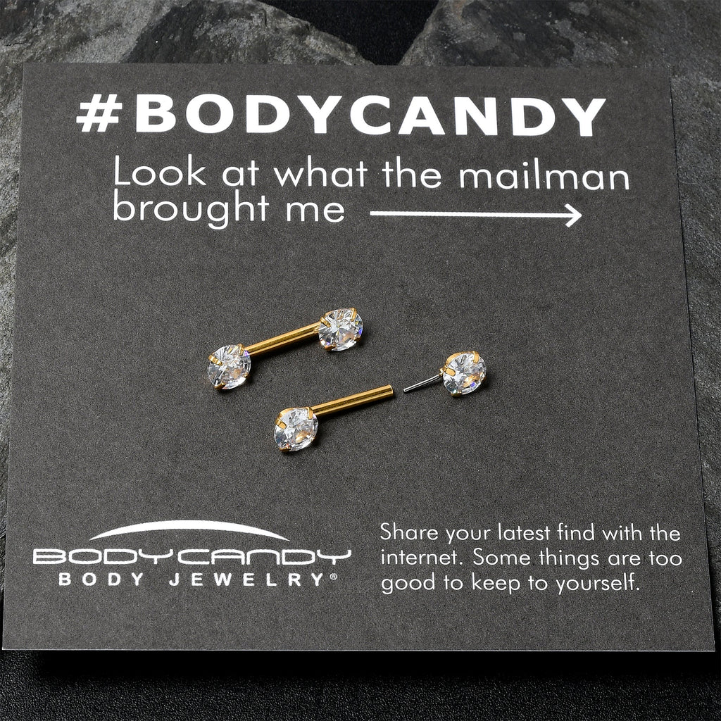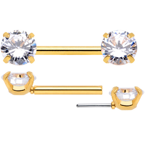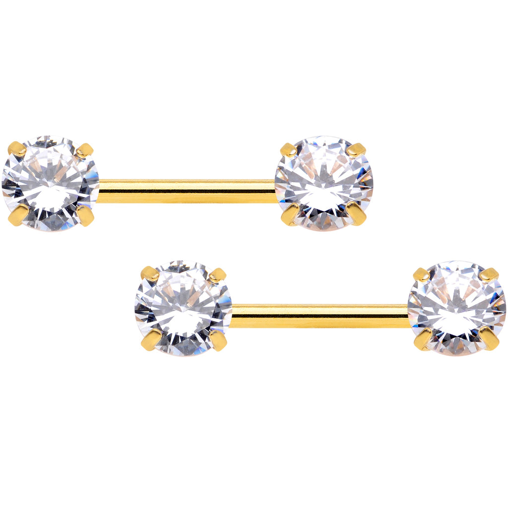 Add some sexy sophistication to your nipple piercings with this 14 gauge nipple jewelry! It's made with 12mm gold tone PVD over 316L surgical grade stainless steel straight barbells. The charm ends are threadless round clear cubic zirconia gems made to make insertion and removal a breeze while still offering a secure fit. With their easy elegance and uncomplicated sophistication, these nipple piercing rings really do have it all! Sold as a set of two.Specifications