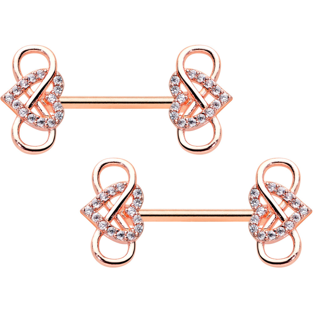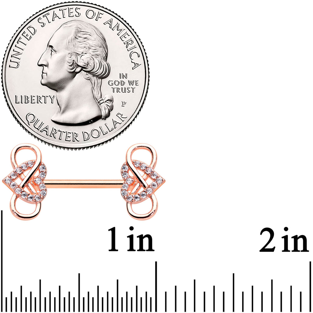 Love can last forever, as symbolized on this 14 gauge nipple jewelry. It's made with 12mm rose gold tone PVD over 316L surgical grade stainless steel straight barbells. Each of the ends features a matching infinity symbol charm. Within their centers are heart charms, paved in clear cubic zirconia gems. You'll fall in love til the end of time....with these elegant, romantic Valentine's Day nipple piercing rings! Sold as a set of two.Specifications