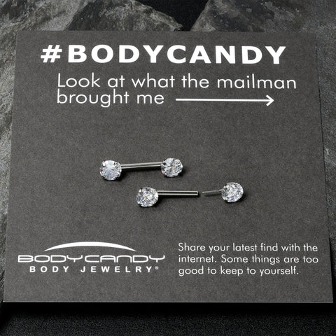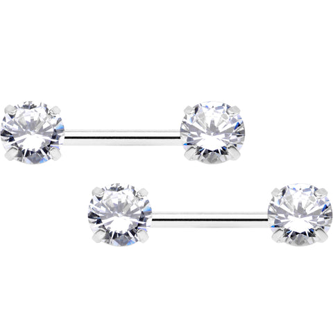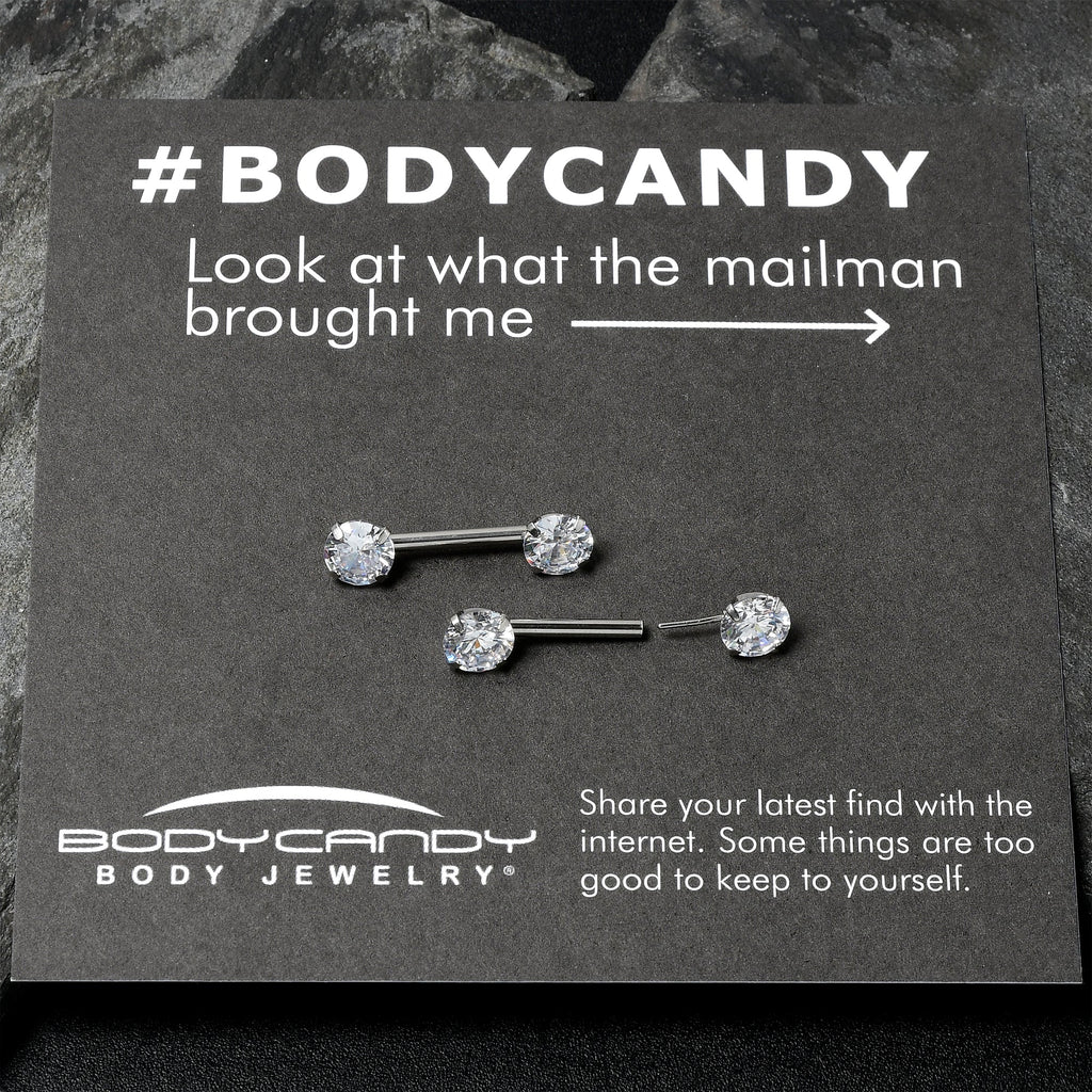 Add some sexy sophistication to your nipple piercings with this 14 gauge nipple jewelry! It's made with 12mm durable 316L surgical grade stainless steel straight barbells. The charm ends are threadless round clear cubic zirconia gems made to make insertion and removal a breeze while still offering a secure fit. With their easy elegance and uncomplicated sophistication, these nipple piercing rings really do have it all! Sold as a set of two.Specifications