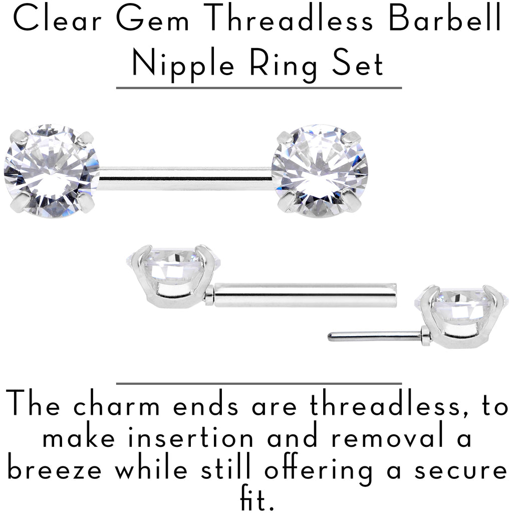 14 Gauge 1/2 Clear CZ Gem Threadless Barbell Nipple Ring Set