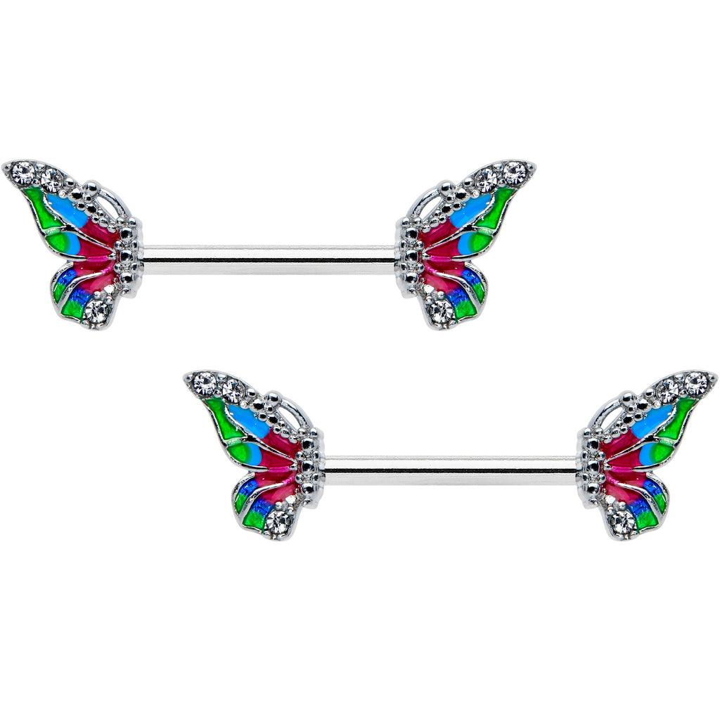 This 14 gauge nipple jewelry is something you can't help but notice! It's made with 12mm durable 316L surgical grade stainless steel straight barbells. Each of the ends features one half of a butterfly charm, inlaid in bright shades of pink, blue, and green. The butterflies are further embellished with clear gems for an added touch of glamour. Let your look spread its wings and soar into style with these bright and beautiful butterfly nipple piercing rings! Sold as a set of two.Specifications