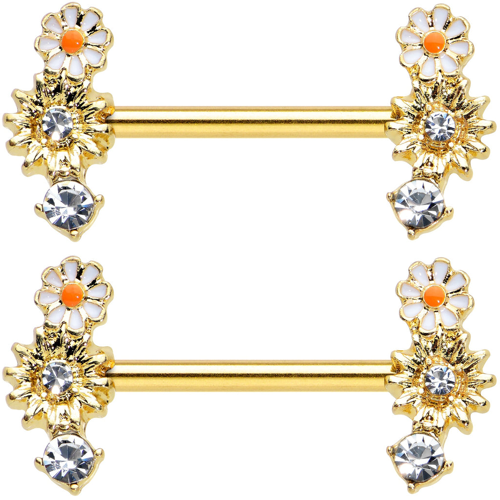 14 Gauge 1/2 Clear Gem Gold Tone Sunny Day Daisy Nipple Ring Set
