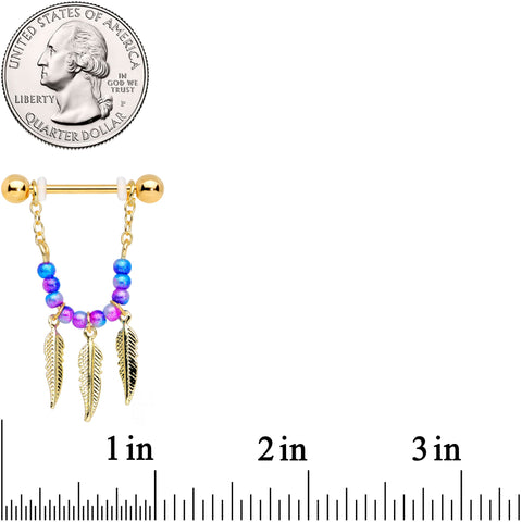 Whether your heart beats for birds or feathers make it flutter, this Southwestern styled nipple jewelry will make your nipple piercings take wing! They're made with 12mm gold tone plated over 316L surgical grade stainless steel straight barbells with 5mm ball ends. Each one features a dangling strand of ombre blue, fuschia, and purple beads with a pearlescent finish. Hanging from each beaded strand is a trio of feather charms. You can adjust the dangling portion along the barbell so you get just the look you're after! Let your nipple piercings spread their wings and fly in colorful style with these striking dangle nipple rings! Sold as a set of two.Specifications