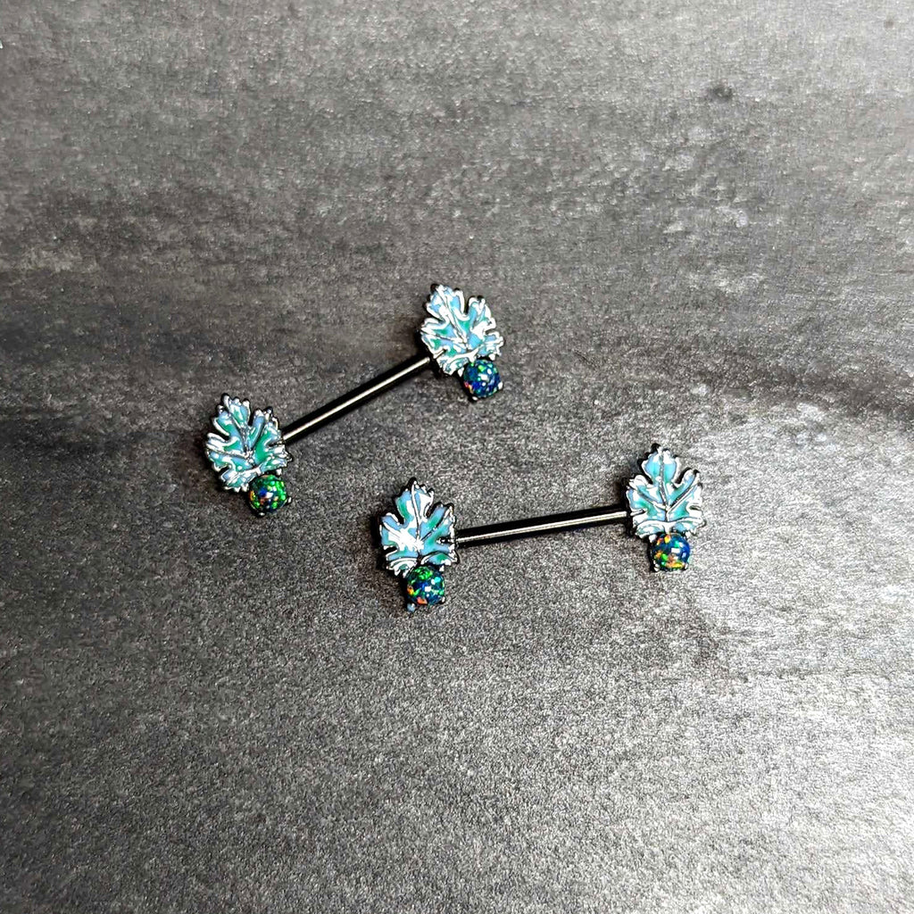 14 Gauge 1/2 Green Synthetic Opal Black Fall Leaf Nipple Ring Set