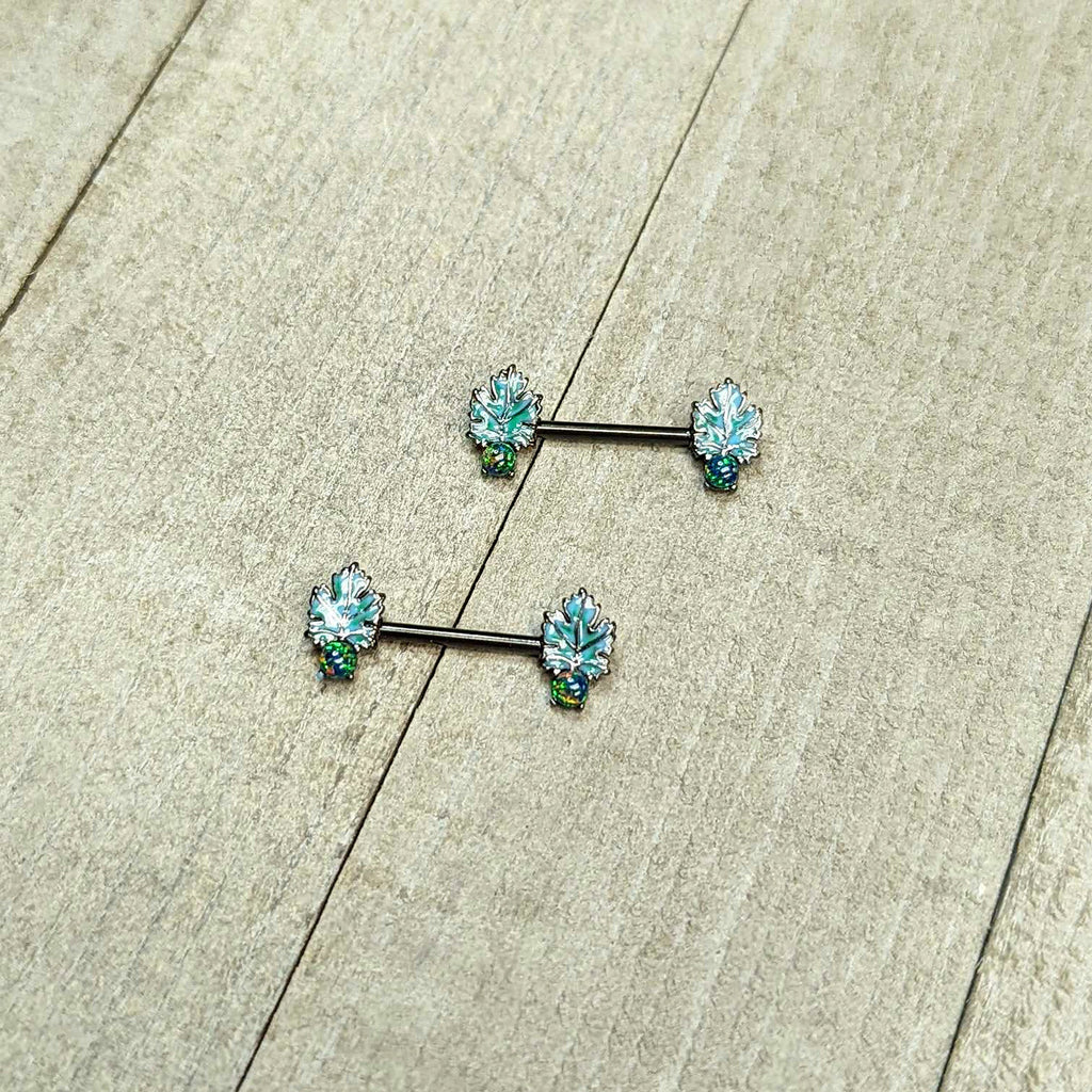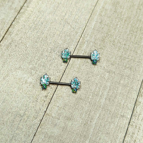 This 14 gauge nipple jewelry will add some leafy green to your look! It's made with 12mm black PVD over 316L surgical grade stainless steel straight barbells. Each of the ends features a green inlay maple leaf charm. The maple leaves are further embellished with green synthetic opals at their bases. You'll never want these leaves to fall when you're rocking them in your nipple piercings! Sold as a set of two.Specifications