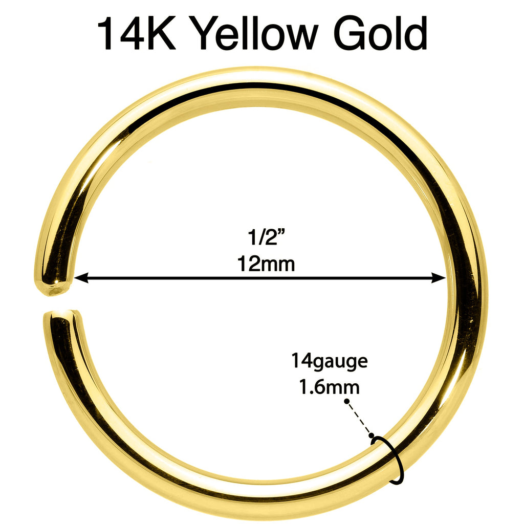 This 14 gauge closure ring will have your piercings looking as good as gold! It's made with a 12mm solid 14k yellow gold circular ring and is handcrafted and hand-polished too. It's easy to insert and remove - Just give it a light twist, insert it into your piercing and gently bend it closed. And you can rock this jewelry in multiple piercings including nipple, septum, and some conch piercings. And it's handmade in the USA!