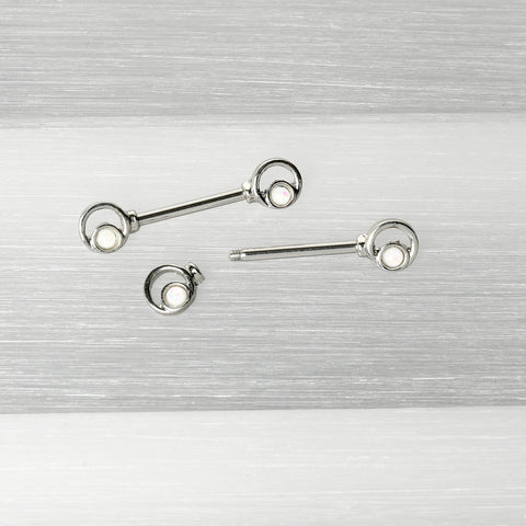 If you've been going in circles looking for the perfect nipple jewelry, these 14 gauge beauties have you covered! It's made with 14mm durable 316L surgical grade stainless steel straight barbells. Each of the ends features a circle charm, set with a round, white faux opal for a symmetrical effect you can't help but love. These circles are ones you'll love being a part of! Sold as a set of two.