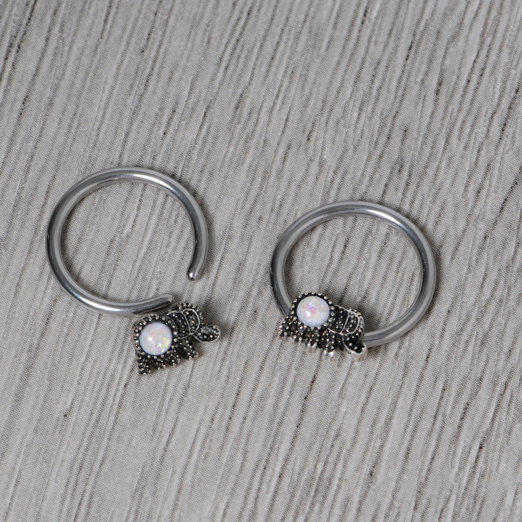Elephants are said to never forget.....and you'll be unforgettable in these 14 gauge nipple rings! They're made with 12mm durable 316L surgical grade stainless steel circular rings The captive rings feature a small captive elephant charm set with a white faux opal. The overall look is a romantic and alluring take on a classic style. You won't forget this nipple jewelry any time soon! Sold as a set of two.