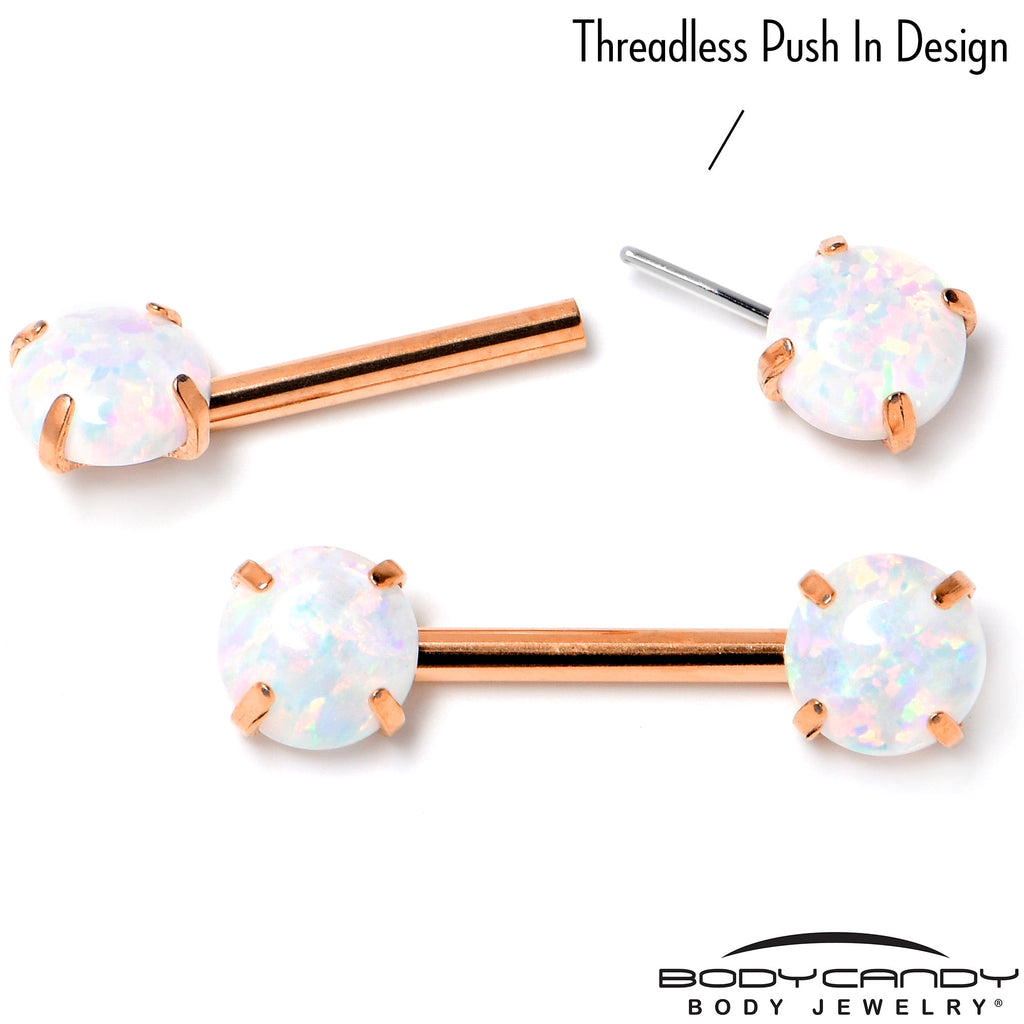 14 Gauge (1.6mm), 1/2" (12mm), Rose Gold Tone PVD over 316L Surgical Grade Stainless Steel Straight Barbell, Synthetic Opal, Threadless Design, Sold as a Pair