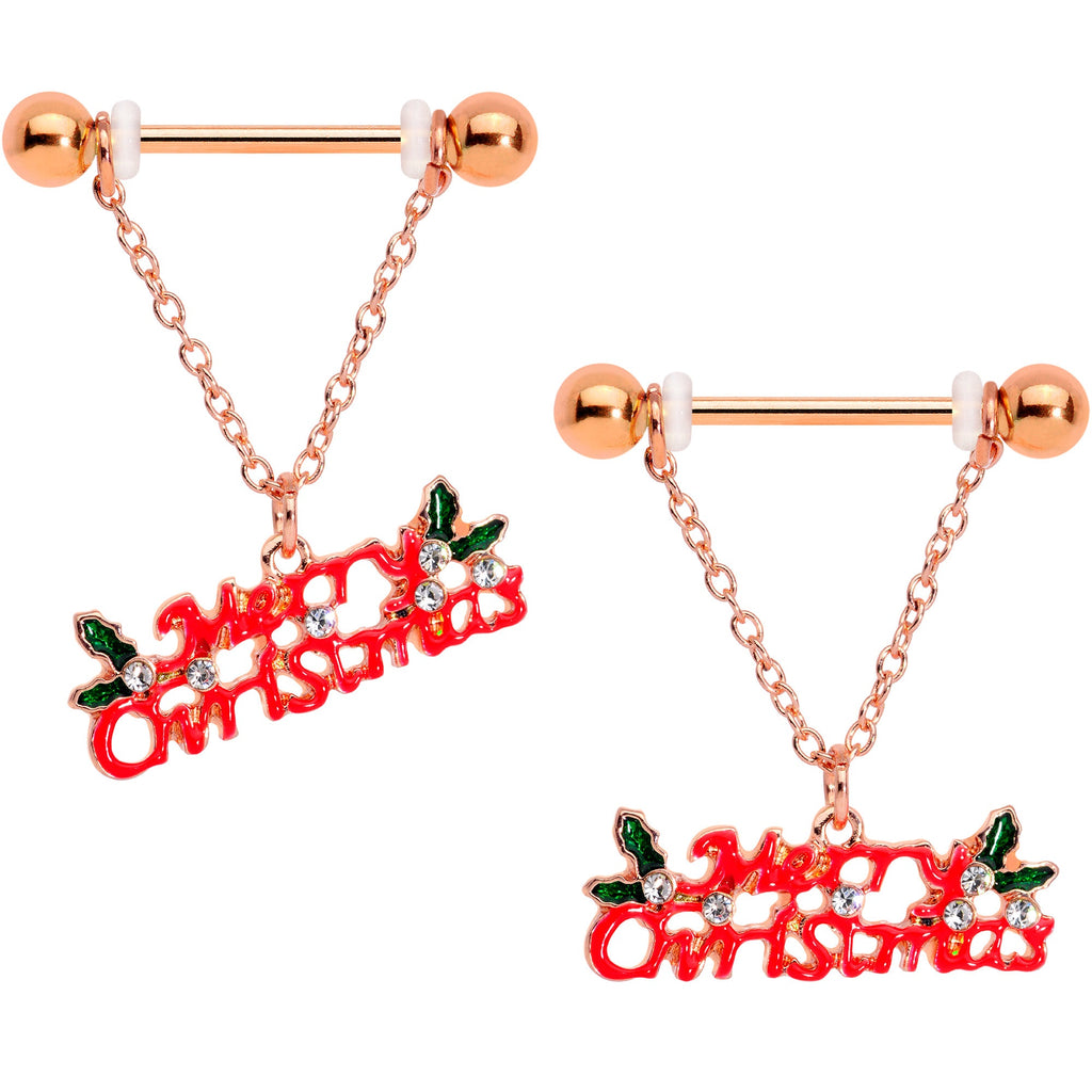 Keep the message simple with this 14 gauge nipple jewelry! It's made with 17mm rose gold tone PVD over 316L surgical grade stainless steel straight barbells with 5mm ball ends. Each one features a length of matching rose gold tone chain that supports a charm that says "Merry Christmas" in red. The charms are embellished with sprigs of holly and small clear gems for a look that's festive without being overwhelming. Get right to the point with your holiday greetings with these simple and sexy nipple piercing rings! Sold as a set of two.Specifications