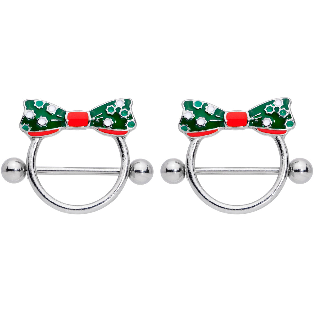 Wrap those piercings with a bow when you're wearing this 14 gauge nipple jewelry! It's made with a 17mm wearable length 316L surgical grade stainless steel straight barbells with 5mm ball ends. The shield portions have a 14mm rise. They feature green bows on the top, with white polka dots. They further embellished with red inlaid centers and red detailing along the bottom side of the bows. Turn your nipple piercings into presents with these holiday bow-themed nipple shields! Sold as a set of two.Specifications