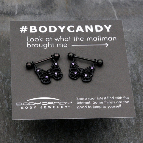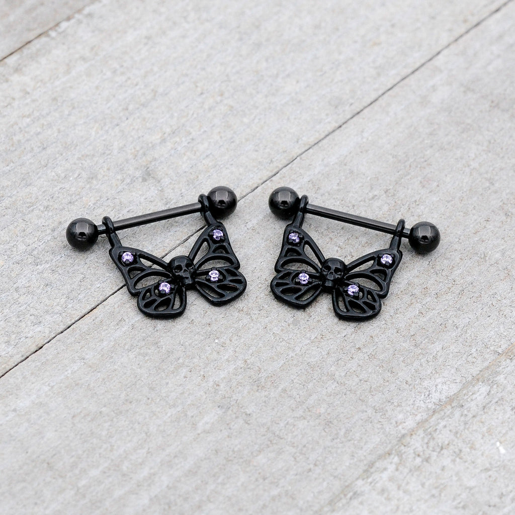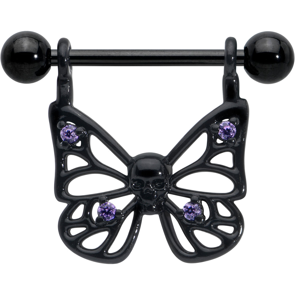 14G 11/16 Purple CZ Gem Black Skull Butterfly Dangle Nipple Ring Set