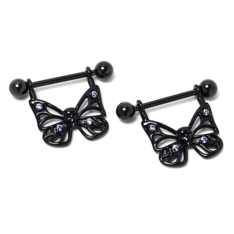 Even butterflies like to play in the dark, like on this 14 gauge nipple jewelry. It is made with 18mm black PVD over 316L surgical grade stainless steel straight barbells with 5mm ends. Each one features a black dangle butterfly charm. The butterflies have lacy, openwork wings which are embellished with petite purple cubic zirconia gems for a demure touch of color. They are further embellished with raised skulls at their centers. Let your look fly by night with these gothic butterfly nipple piercing rings. Sold as a set of two.