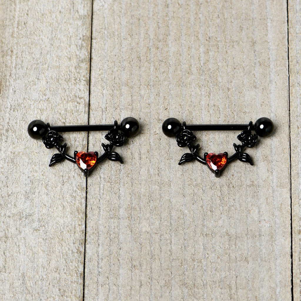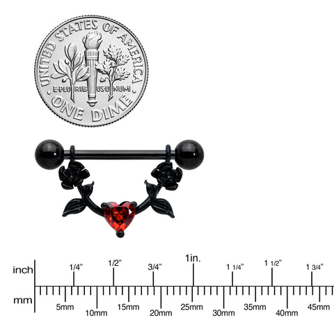 Celebrate love in gothic style with this 14 gauge nipple jewelry! It's made with 18mm black PVD over 316L surgical grade stainless steel straight barbells with 5mm ball ends. The dangling portions are each composed of a pair of detailed black flowers. At the central point is a red, heart-shaped cubic zirconia gem for a stunning touch of eye-catching color. These gorgeously goth styled nipple piercings rings are sure to steal your heart! Sold as a set of two.Specifications