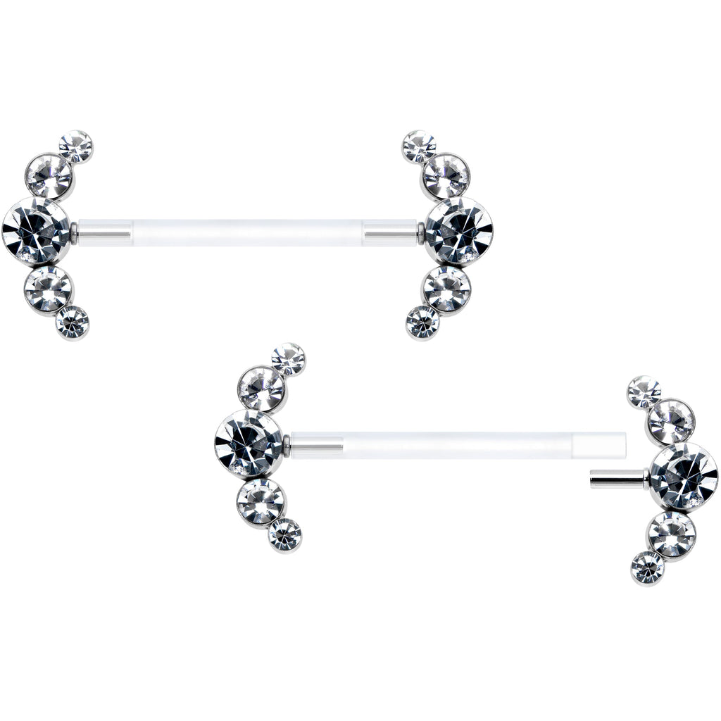 Whether you're looking for a more subtle look or you just want to up your comfort level, you're all set with this 14 gauge nipple jewelry. It's made with 20mm flexible Bioplast straight barbells and features eye-catching clear gem charm ends that will always have your nipple piercings looking on point! The ends feature a gently curved design with five round, clear gems for extra glamour. This nipple piercing jewelry is more than ready to make its way into your pierced nipples for a style that will bring low-maintenance glamour to any situation. Sold as a set of two.Specifications