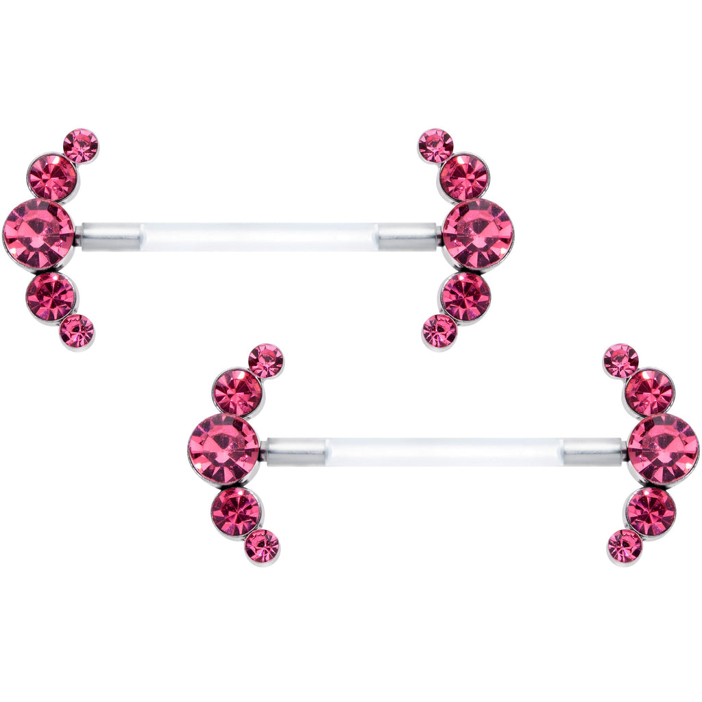 Whether you're looking for a more subtle look or you just want to up your comfort level, you're all set with this 14 gauge nipple jewelry. It's made with 20mm flexible Bioplast straight barbells and features eye-catching pink gem charm ends that will always have your nipple piercings looking on point! The ends feature a gently curved design with five round, pink gems for extra glamour. This nipple piercing jewelry is more than ready to make its way into your pierced nipples for a style that will bring low-maintenance glamour to any situation. Sold as a set of two.Specifications
