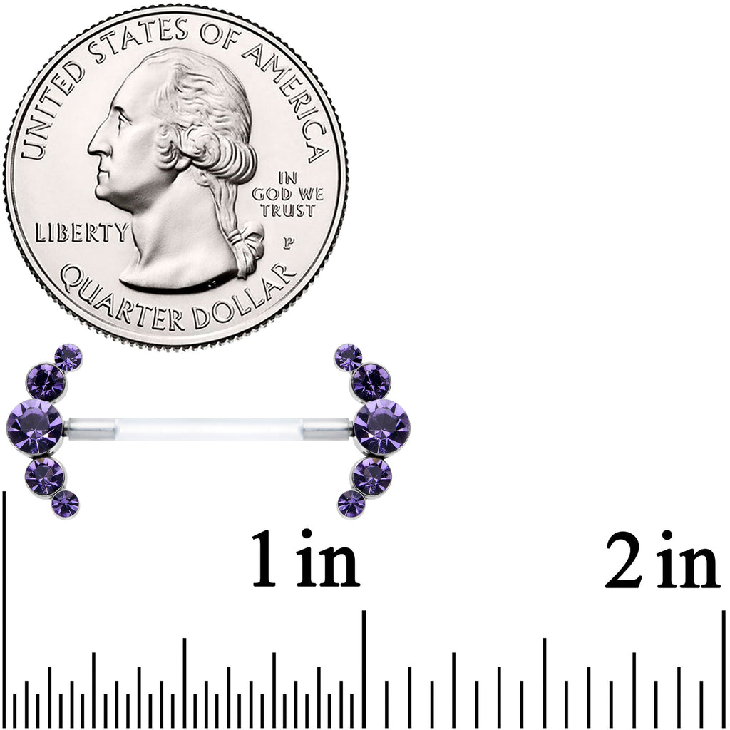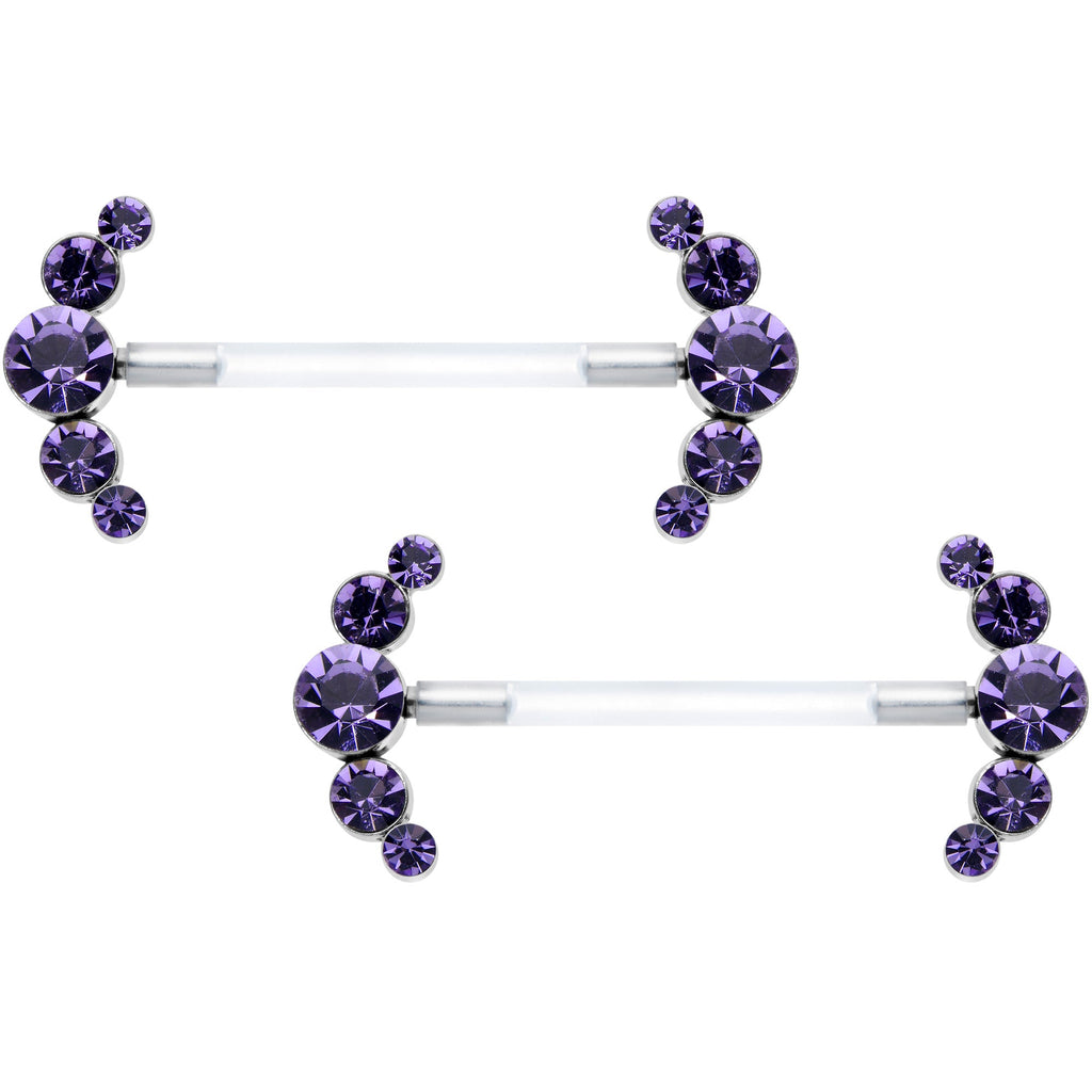 Whether you're looking for a more subtle look or you just want to up your comfort level, you're all set with this 14 gauge nipple jewelry. It's made with 20mm flexible Bioplast straight barbells and features eye-catching purple gem charm ends that will always have your nipple piercings looking on point! The ends feature a gently curved design with five round, purple gems for extra glamour. This nipple piercing jewelry is more than ready to make its way into your pierced nipples for a style that will bring low-maintenance glamour to any situation. Sold as a set of two.