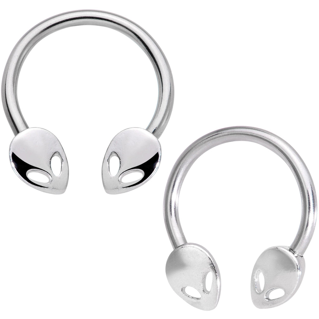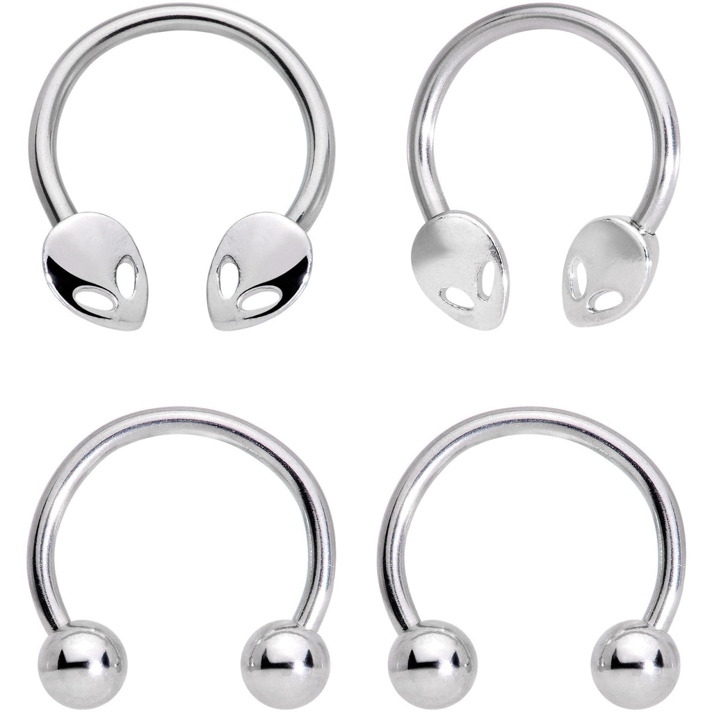 This 14 gauge set of nipple piercings gives you some eye-opening choices to make! Made with .51" diameter durable 316L surgical grade stainless steel circular barbells, this set features two different pairs for you to choose from. The first pair are classic, simple horseshoe rings with 5mm ball ends. The second pair of horseshoe rings feature ends shaped like alien faces with cut-out eyes, giving them a subtly sinister appearance and adding depth and dimension to their faces. These nipple rings will have you absolutely wide-eyed with delight! Sold as a set of four.