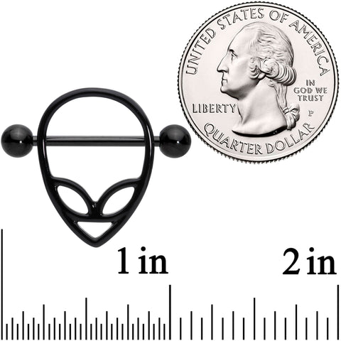 Finish your look with something stellar when you wear these 14 gauge alien nipple shields. Made with 19mm black PVD over 316L surgical grade stainless steel straight barbells with 5mm ball ends, the shield portion is made in the shape of an alien from outer space. They're absolutely out of this world! Sold as a set of two.Specifications