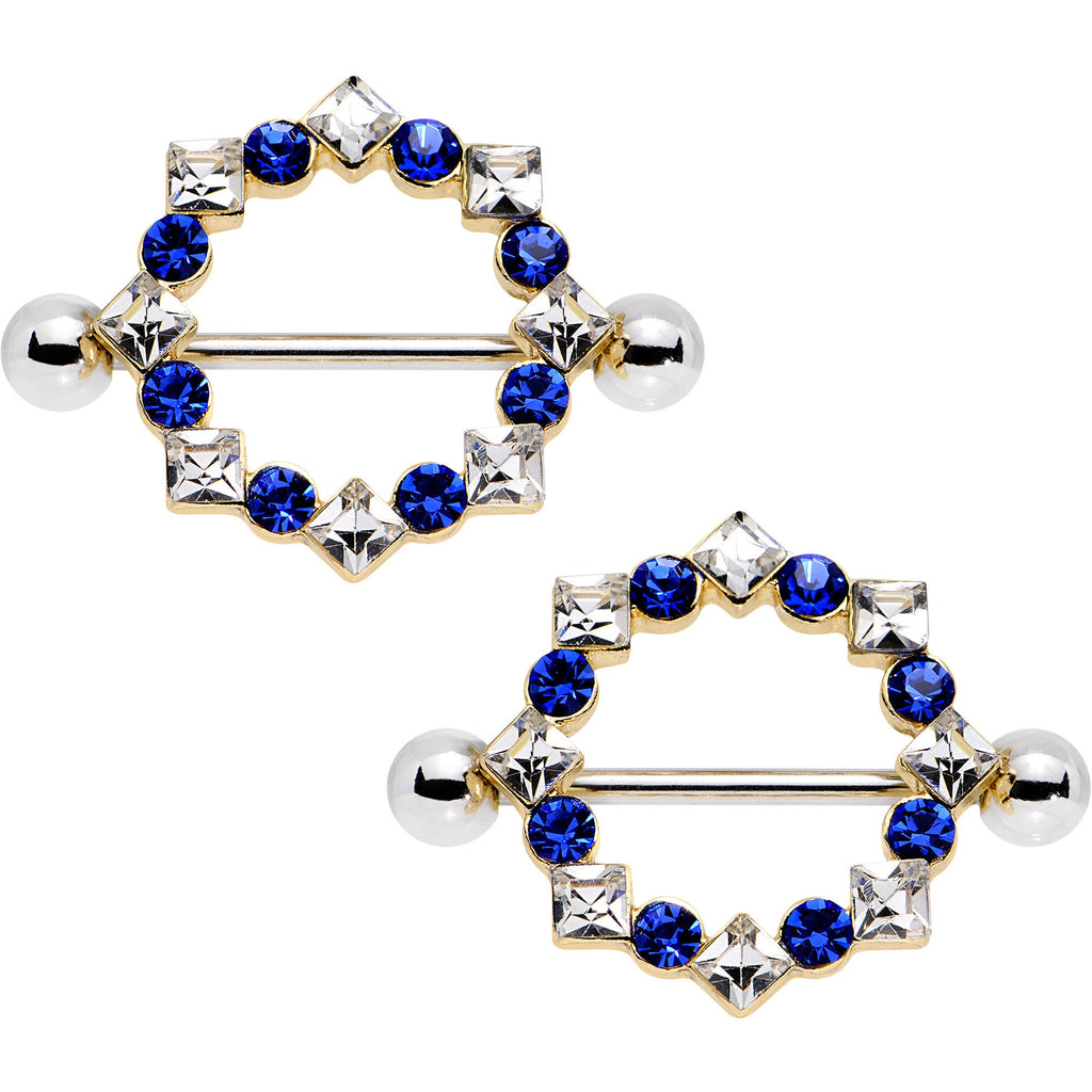 There's no doubt you're a queen, so treat yourself like one with this clear blue gem, crown-style 14 gauge nipple shield with a 15mm rise. The shield features alternating reflective diamond shaped and stunning royal blue gems on a set of 19mm long durable 316L surgical grade stainless steel straight barbells. Sold as a set of two, these nipple shields are perfect for exuding your royal side and will look wonderful on your breasts. Sold as a set of two.