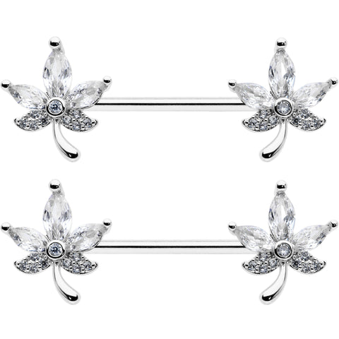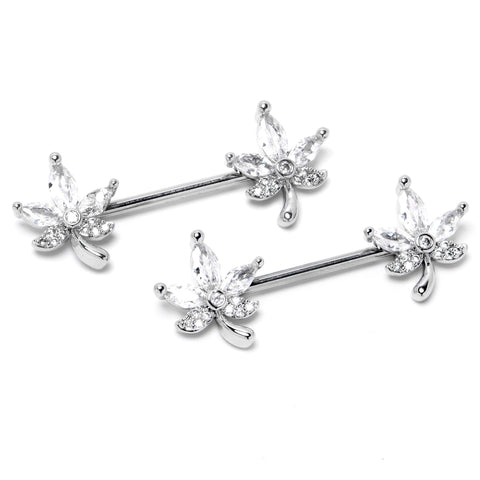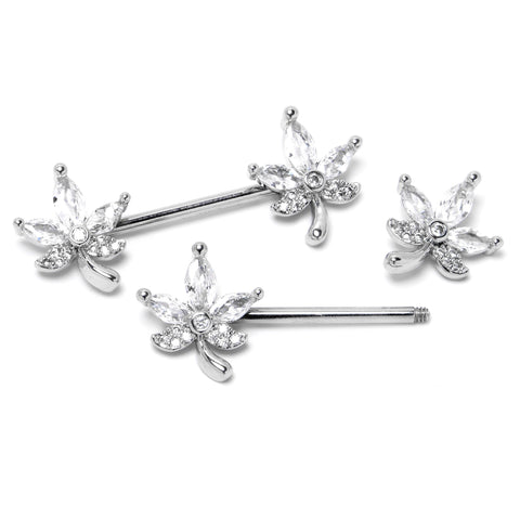 14G 3/4 Clear CZ Gem Pot Leaf Barbell Nipple Ring Set