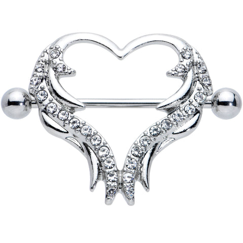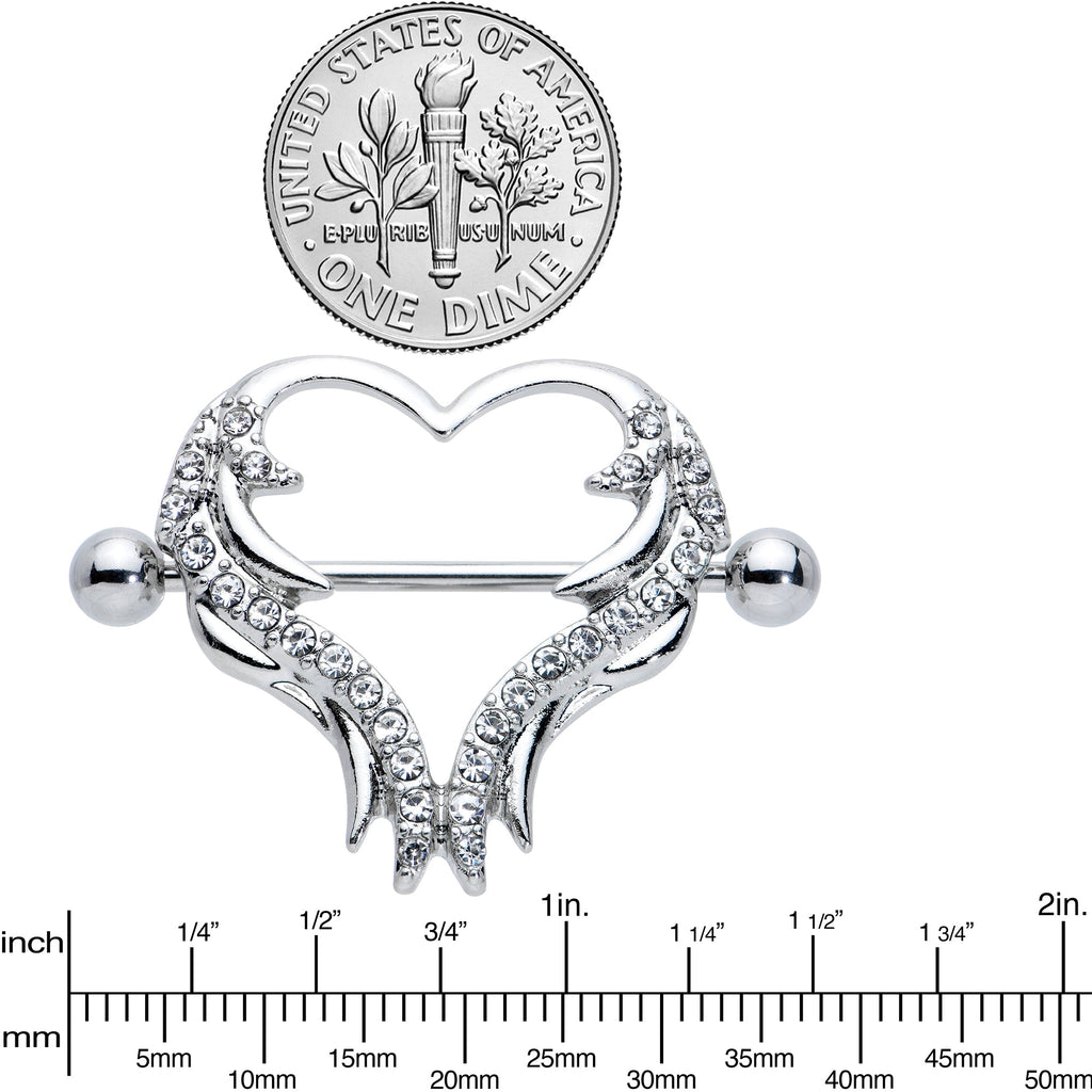 Give your heart to rock music with this 14 gauge nipple jewelry! It's made with 19mm wearable length 316L surgical grade stainless steel straight barbells with 5mm ball ends. The shield portion features a heart charm, with wild, splashy lines that have an 80s retro feel. They're embellished with clear gems for an added detail that gives a perfectly cohesive touch of glamour. If you love to rock and you're ready to show, these retro nipple shields are sure to get you rolling! Sold as a set of two.Specifications
