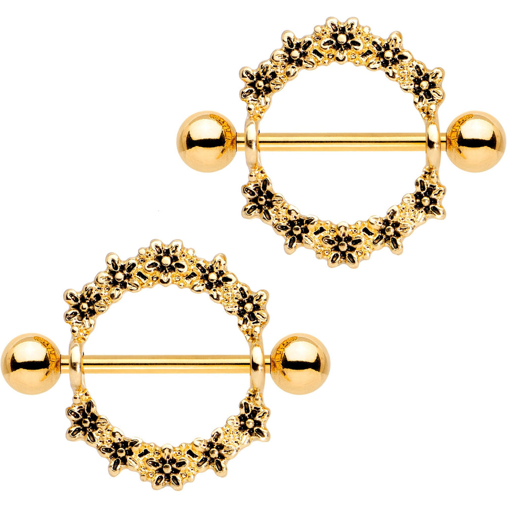 Dress up your breasts with floral beauty when you wear this pretty pair of 14 gauge nipple piercings. Made with 19mm gold tone anodized over 316L surgical grade stainless steel straight barbells, this set of nipple shields features metalwork floral halo shield charms. This pair of nipple barbells is sold as a set of two for "de seins," of course, and anyone who gets to take in the view!