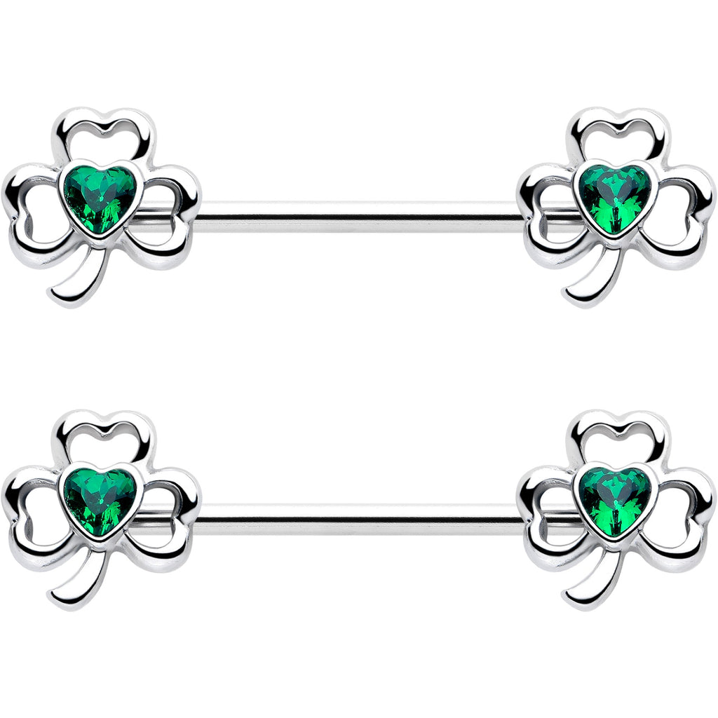 Get lucky with this 14 gauge nipple jewelry. It's made with 19mm durable 316L surgical grade stainless steel straight barbells. Each of the ends features a shamrock with open centered leaves and are each embellished with a green gem heart at the centers for added color and style. Whether you're celebrating St Patrick's Day, expressing your love of all things Irish, or simply need a little luck, these lucky shamrock nipple piercing rings are sure to leave you feeling the love. Sold as a set of two.Specifications