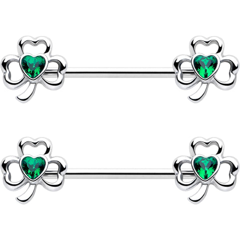 14 Gauge 3/4 Green Gem Heart Shamrock St Patricks Nipple Ring Set